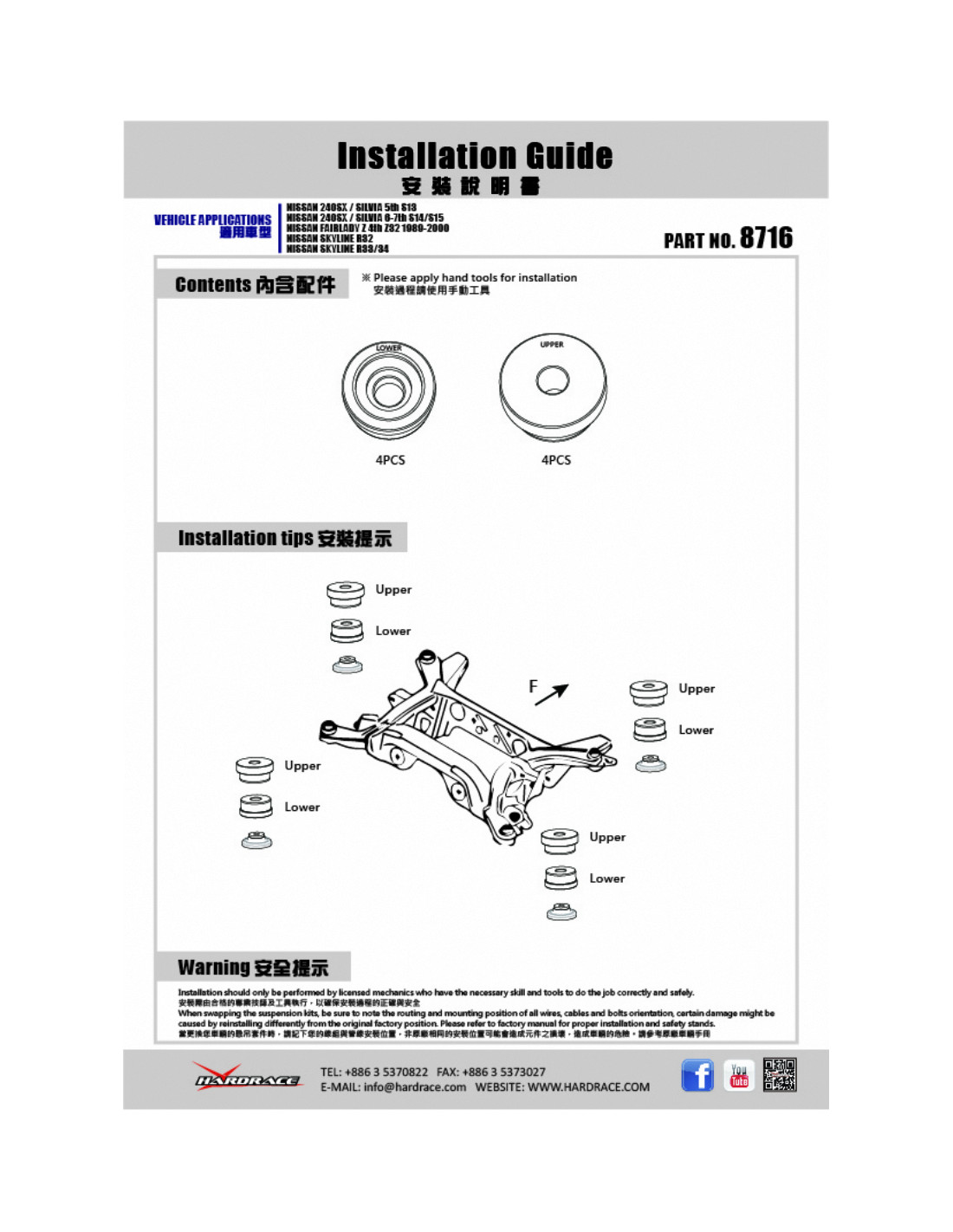 Hardrace silent block for Infiniti Q45, Nissan 240SX, Skyline, Z-series. Ideal for improving driving precision, ride stability, and steering response. Manufacturer's specifications : - SOLID-ALUMINUM 8 PCS/SET