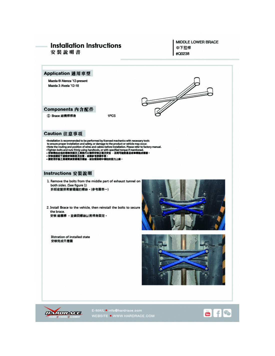 Hardrace strut brace for Mazda 3, 6. Ideal for improving driving precision, ride stability and steering response. Manufacturer's specifications : - 1 PCS/SET