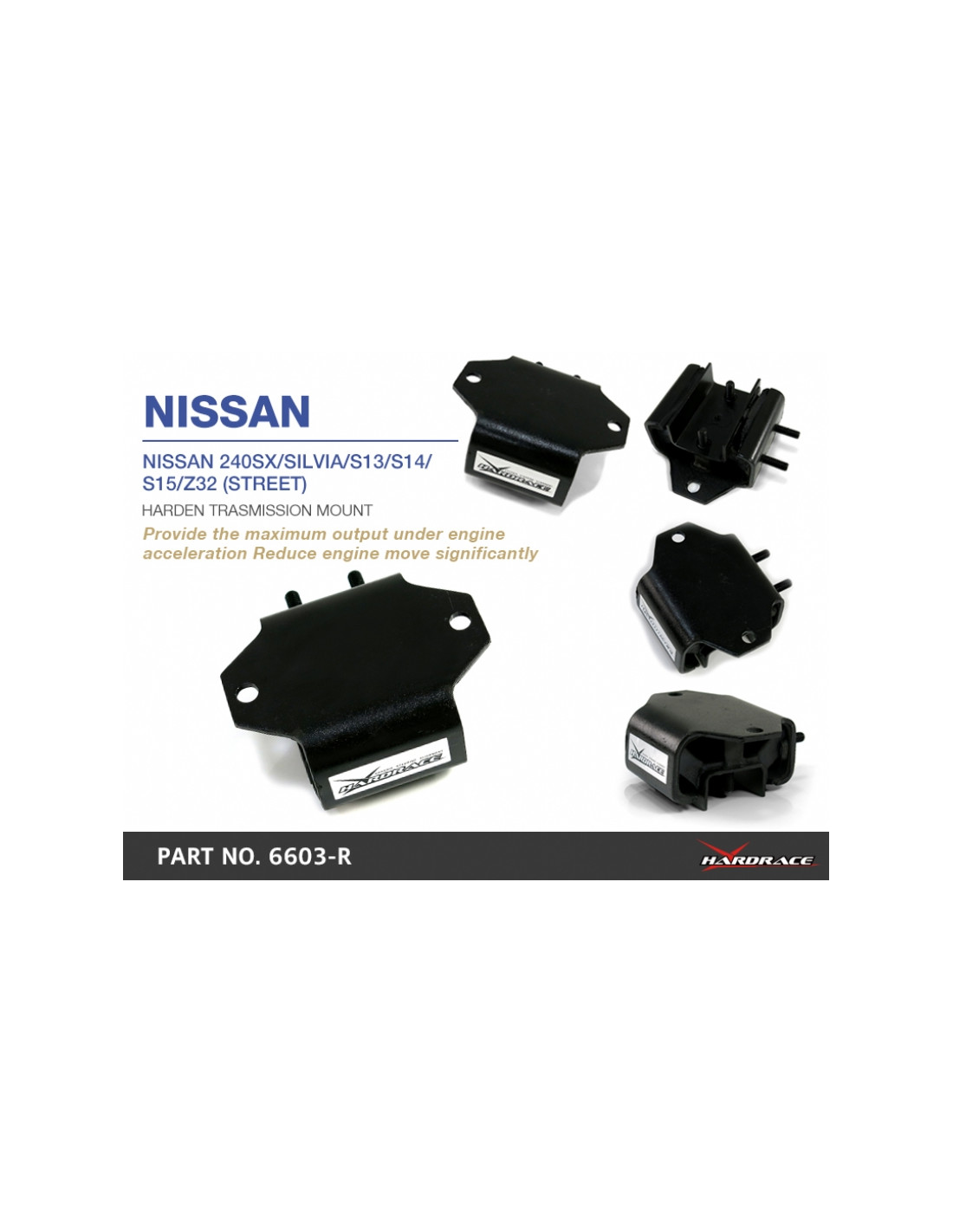 Hardrace engine mount for Infiniti Q45, Nissan 240SX, Z-series. Ideal for improving steering precision, ride stability, and response. Features from the manufacturer (original description in English): - Street Version 1PCS/SET Replaces OE part number: 11320-36F00, 11320-36F01, 11320-35F00, 11320-35F01, 11320-65F00, 11320-65F01, 11320-65F10, 11320-65F11, 11320-85F00, 11320-85F01, 11320-90F00, 11320-90F01, 11320-RS541