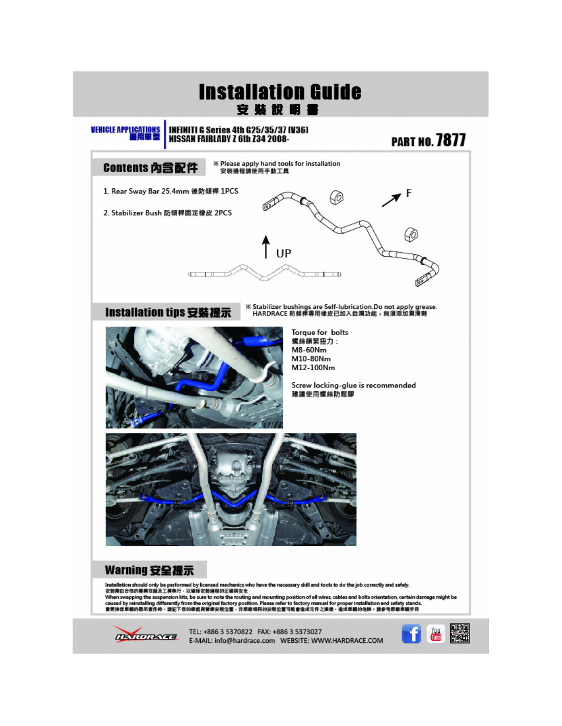 Hardrace stabilizer bar for Infiniti G series, Nissan Skyline, Z-series. Ideal for improving driving precision, ride stability and steering response. Manufacturer's specifications : - 25.4 mm 3 PCS/SET For 370Z 09-13, G37 09-13