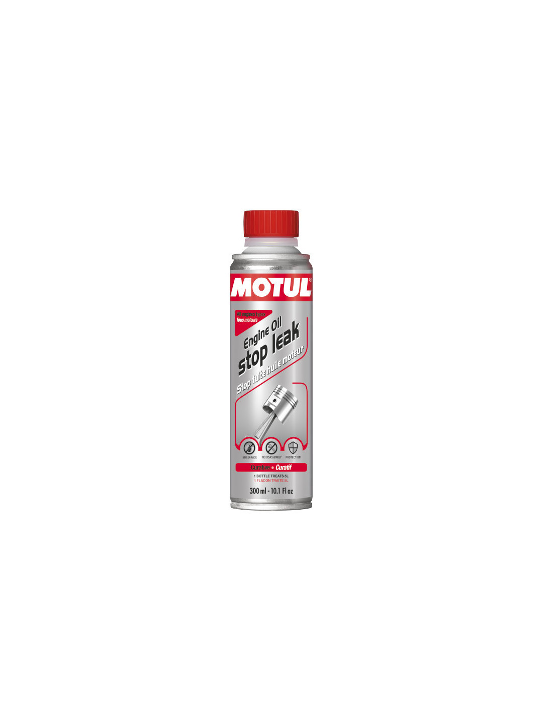Motul Engine Oil Stop LeakSeals small oil leaks and oozingsQuick efficiencyTreats up to 5 liters of engine oilSuitable for any mineral or synthetic oilPackaging: 300 ml bottleMotul Engine Oil Stop Leak SpecificationMotul Engine Oil Stop Leak quickly seals small leaks and oozings in oil circuits. This additive also keeps engine gaskets flexible and restores o-rings. Easy to use it is suitable for all mineral and synthetic oils.The 300 ml bottle is sufficient to treat 5 liters of engine oil. It is to be added directly into the engine oil. Be sure to check the oil level before use.