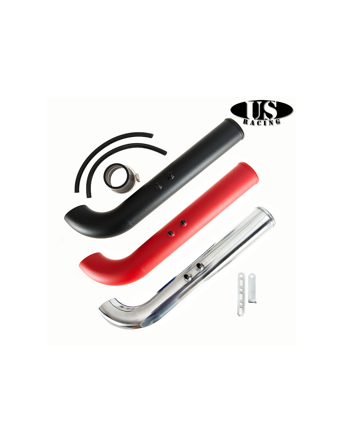 Air intake systems are designed to maximize the airflow through the stock or aftermarket manifold system. By removing the stock molded rubber intake system and adding the quality US-Racing mandrel bent intake piping with a constant radius, maximum airflow through the throttle body is achieved. The maximum airflow results in better throttle response and increases horse power. Short Ram Intakes are designed to take air near the intake manifold, thus resulting in hotter air. To achieve even better performance, with high powered vehicles, Cold Air Intakes are the better option.