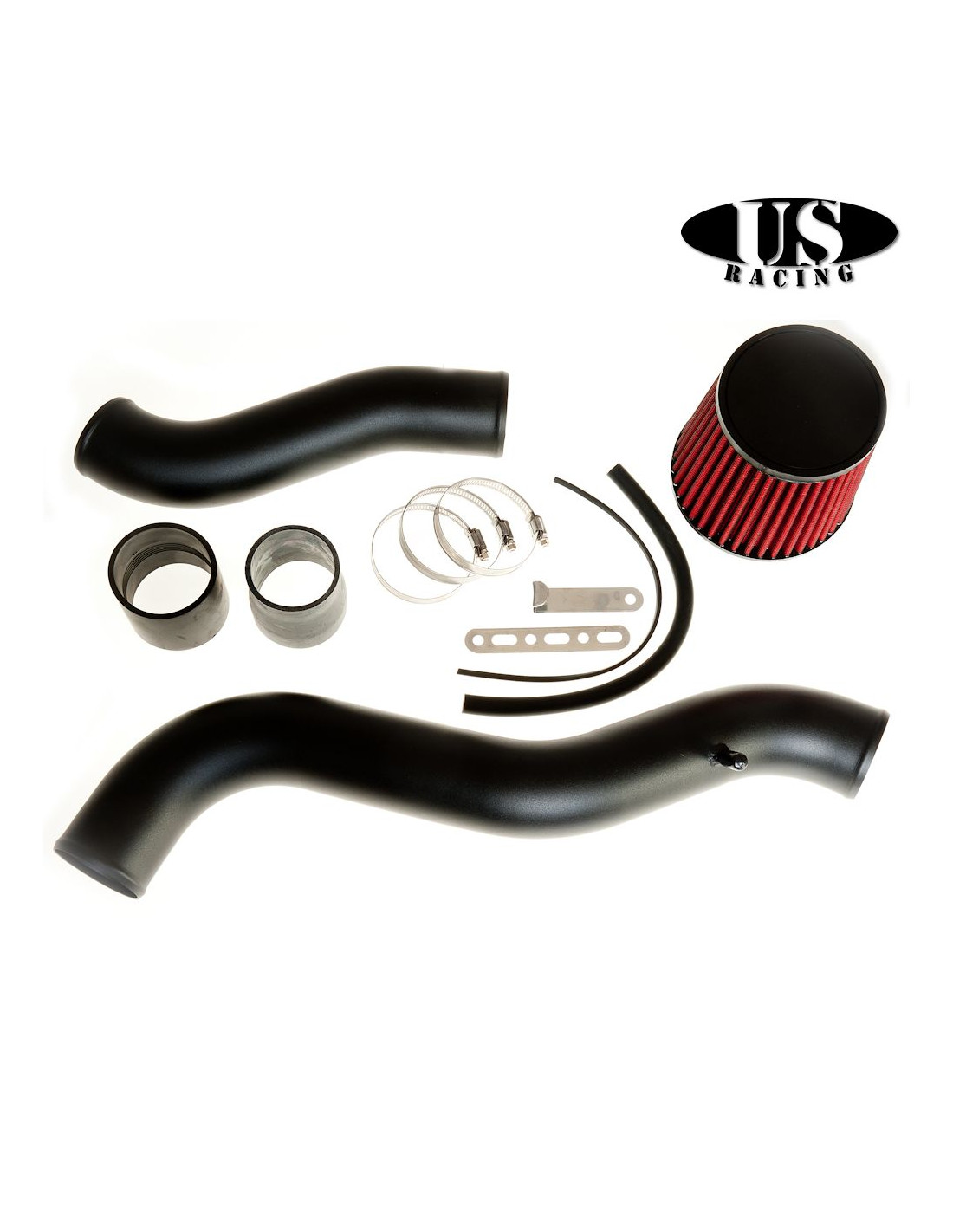Air intake systems are designed to maximize the airflow through the stock or aftermarket manifold system. By removing the stock molded rubber intake system and adding the quality US-Racing mandrel bent intake piping with a constant radius, maximum airflow through the throttle body is achieved. The maximum airflow results in better throttle response and increases horse power. Cold air intakes have long pipes and low filters. Instead of drawing in air from the engine bay where it has had time to heat, the cold air intake draws air in from near the ground, bringing it up to the engine while it is still cool. With this Cold Air Intake, the air is more dense and can be mixed in with the fuel, leading to higher oxygen content and a more powerful explosion, driving the engine faster.