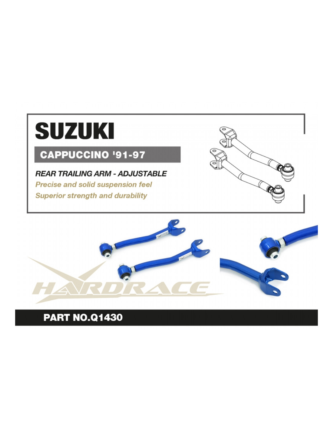 Hardrace suspension arm for Suzuki Cappuccino. Ideal for improving steering precision, stability, and response. Manufacturer's description: - Adjustable Harden Rubber Equipped 2PCS/SET