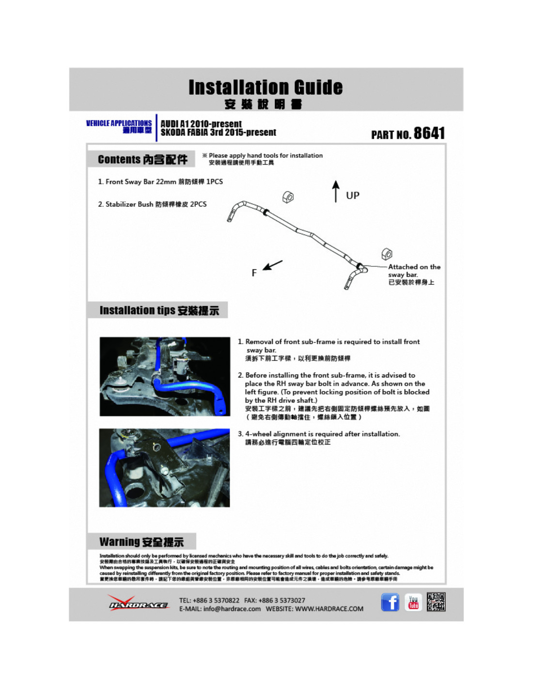 Hardrace Stabilizer Bar for Audi A1, Skoda Fabia. Ideal for improving driving precision, ride stability, and steering response. Manufacturer's Specifications : - 22 mm 3 PCS/SET *Not for Audi S1 use
