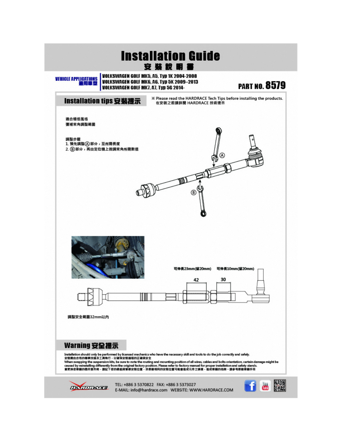 Super Angle Hardrace Steering Linkage for Audi, Skoda, Volkswagen. Ideal for improving steering precision, ride stability, and steering response. Manufacturer's Specifications : - 2 PCS/SET +25mm extend * For HellaFlush use