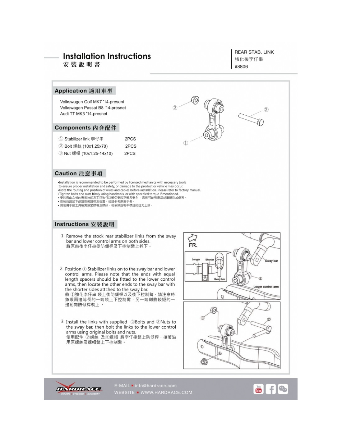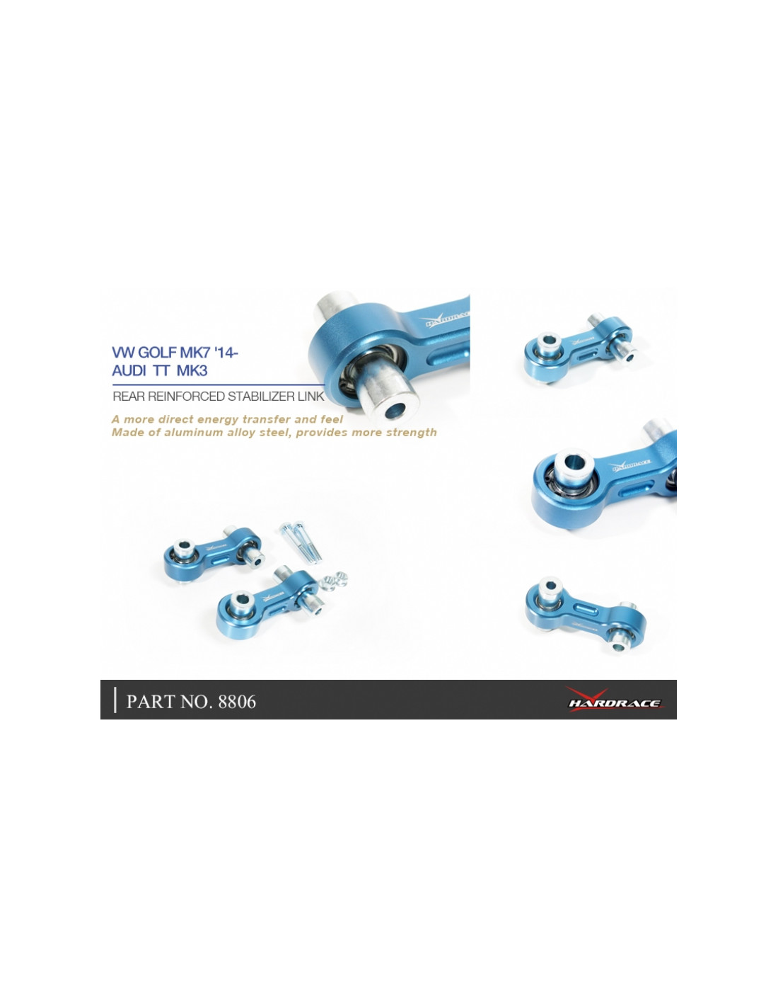 Hardrace stabilizer bar link for Audi, Skoda, Volkswagen. Ideal for improving driving precision, ride stability, and steering response. Manufacturer's description: - CNC Aluminum Body + Pillow Ball 2 PCS/SET