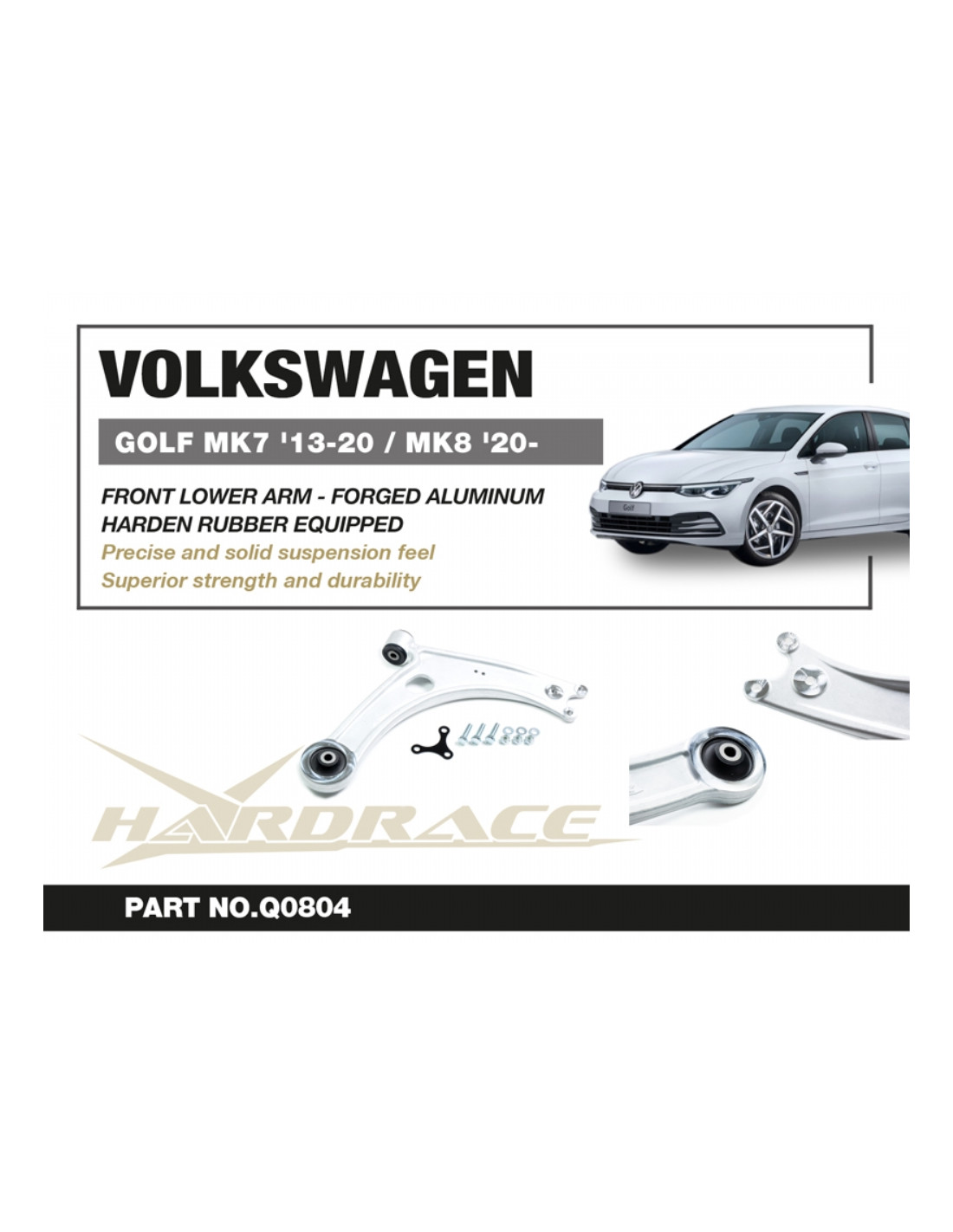 Hardrace suspension arm for Audi, Volkswagen, Skoda. Ideal for improving steering precision, stability, and response. Manufacturer's specifications : - Forged aluminum, hardened rubber, equipped with 2 pcs/set.