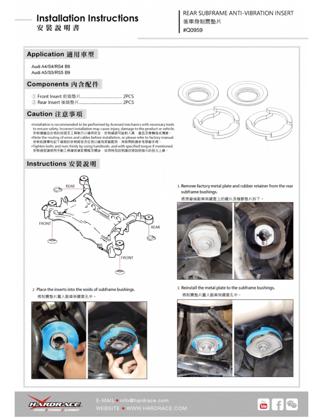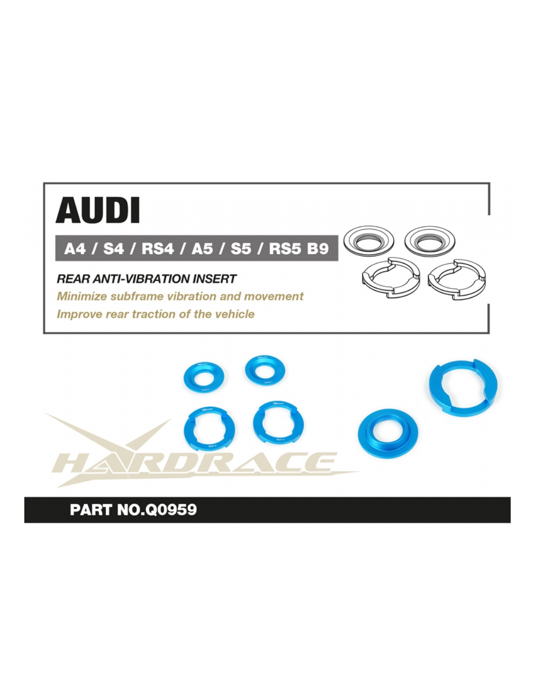 Hardrace silent block for Audi A4, S4/RS4, A5, S5/RS5. Ideal for improving driving precision, ride stability, and steering response. Manufacturer's specifications : - 4 PCS/SET