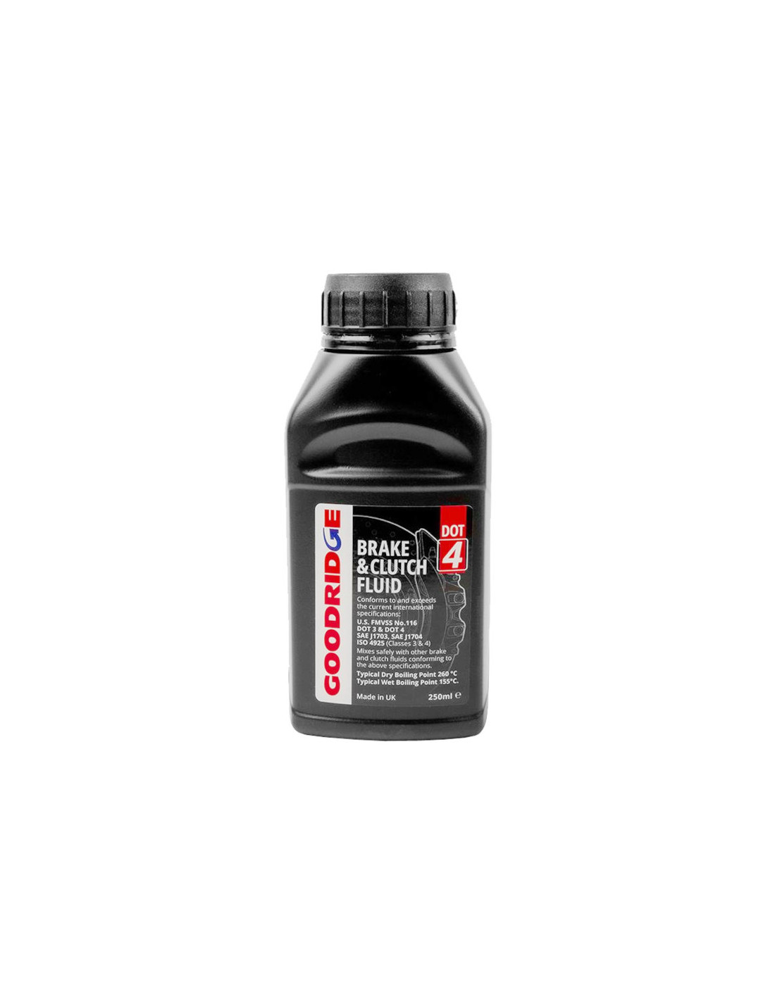 Goodridge DOT 4 Performance Brake FluidIdeal for sporty road drivingWet boiling point 269°CCompatible with DOT 3 and DOT 4 systemsPackaging : 250 mL bottleMade in UK Goodridge DOT 4 Brake Fluid SpecificationsGoodridge DOT 4 Performance brake fluid has been formulated for frequent sporty street use and is suitable for drivers who are continually on and off the brakes. It has a higher boiling point than most OEM fluids and can be mixed with all DOT 3 and DOT 4 products.Characteristics :Dry boiling point (fresh fluid) : 269°C/516°FWet boiling point (used fluid) : 159°C/318°FCertifications : US FMVSS 116 DOT 4 DOT 3 SAE J 1703 SAE J 1704 ISO 4925 (Classes 3 & 4)Packaged in a 250 mL bottle
