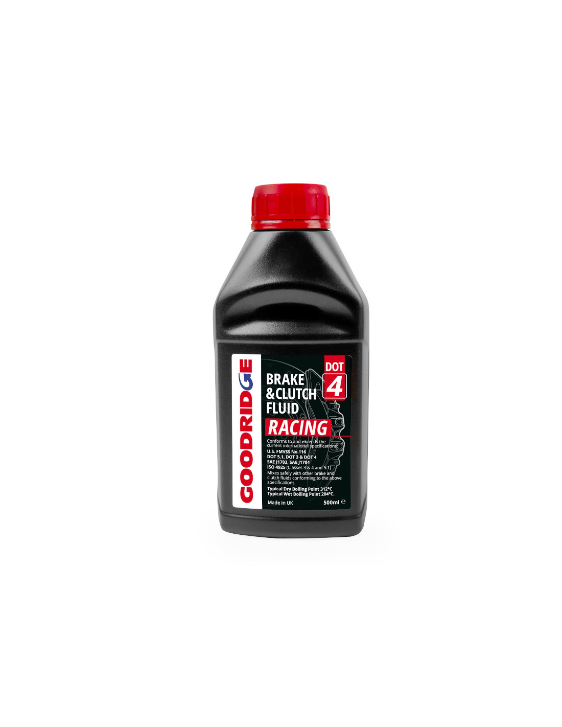 Goodridge DOT 4 Racing Brake FluidIdeal for racingWet boiling point 312°CCompatible with DOT 3 and DOT 4 systemsPackaging : 500 mL bottleMade in UK Goodridge DOT 4 Racing Brake Fluid SpecificationsGoodridge DOT 4 Racing brake fluid has been specially formulated for track and competition use and is ideal for racing teams operating at the highest level of their sport. It has a very high boiling point for consistent performance and can be mixed with all DOT 3 and DOT 4 products.Characteristics :Dry boiling point (fresh fluid) : 312°C/593°FWet boiling point (used fluid) : 204°C/399°FCertifications : US FMVSS 116 DOT 4 DOT 3 SAE J 1703 SAE J 1704 ISO 4925 (Classes 3 & 4)Packaged in a 500 mL bottle
