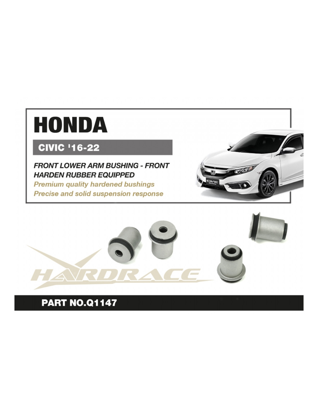 Hardrace silent block for Honda Civic. Ideal for improving driving precision, trim stability, and steering response. Manufacturer's specifications : - Harden Rubber Equipped 2PCS/SET