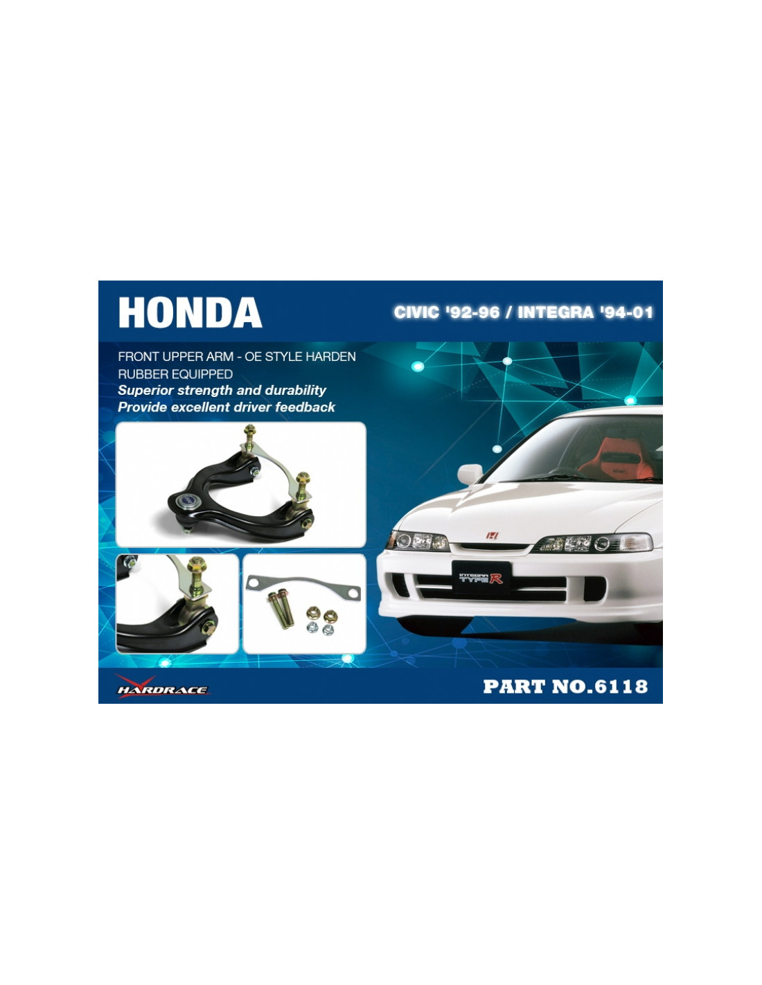 Hardrace suspension arm for Honda Civic, Integra. Ideal for improving steering precision, stability, and response. Manufacturer's specifications : - OE Style Harden Rubber Equipped 2 PCS/SET