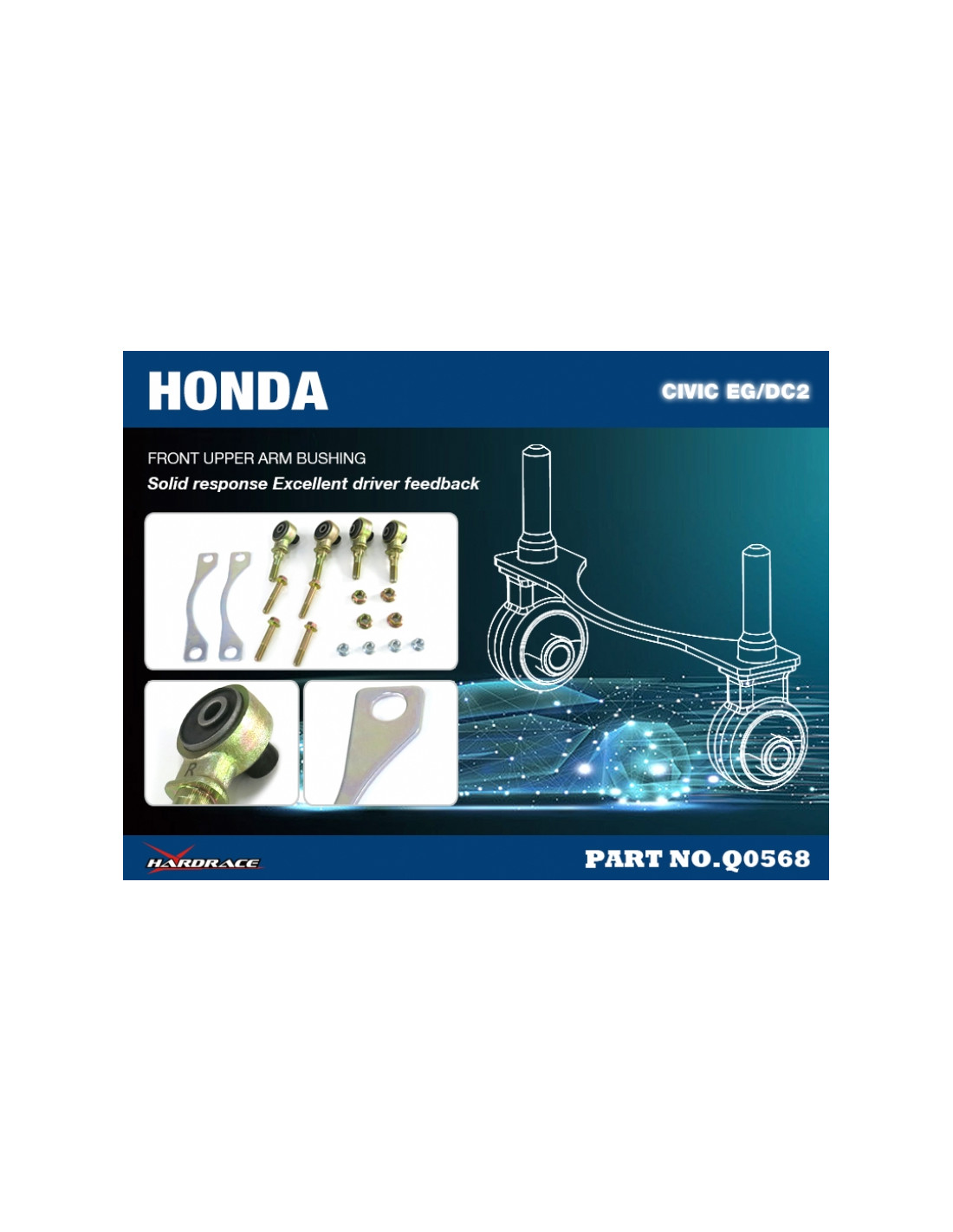 Hardrace silent block for Honda Civic, Crx, Integra. Ideal for improving driving precision, trim stability, and steering response. Manufacturer's specifications (original description in English): - Harden Rubber Equipped CAMBER -0.5°, CASTER +0.5° 6 PCS/SET