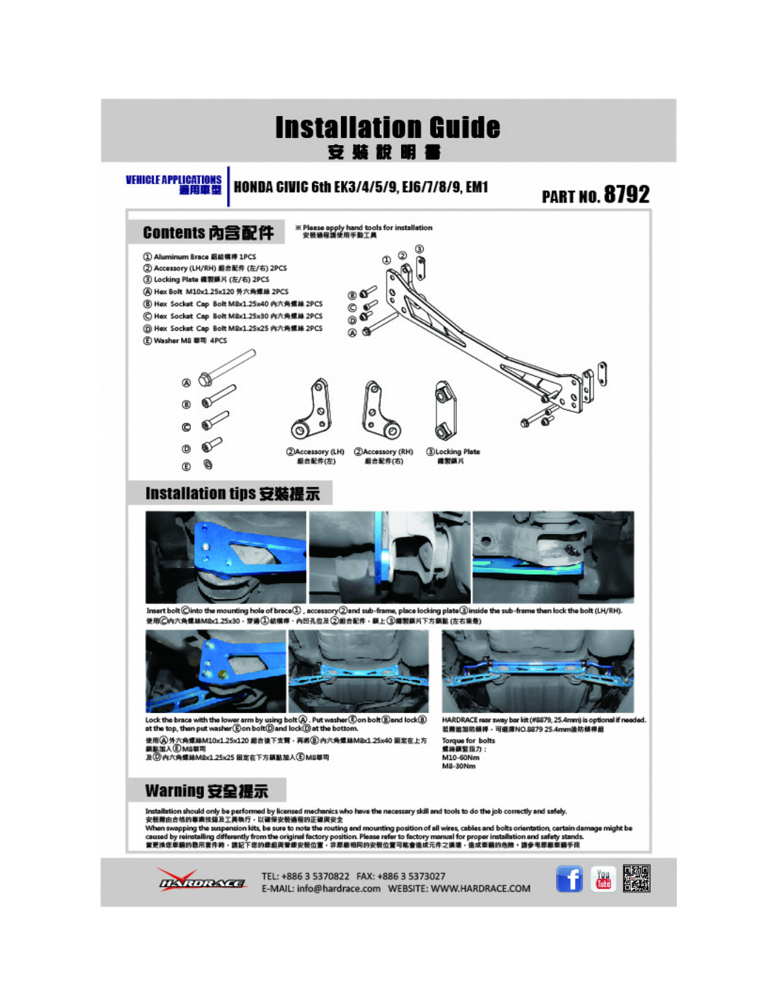 Hardrace for Honda Civic Black. Ideal for improving driving precision, trim stability, and steering response. Manufacturer's specifications : - 5 PCS/SET NOT FOR EK9 TYPE-R USE