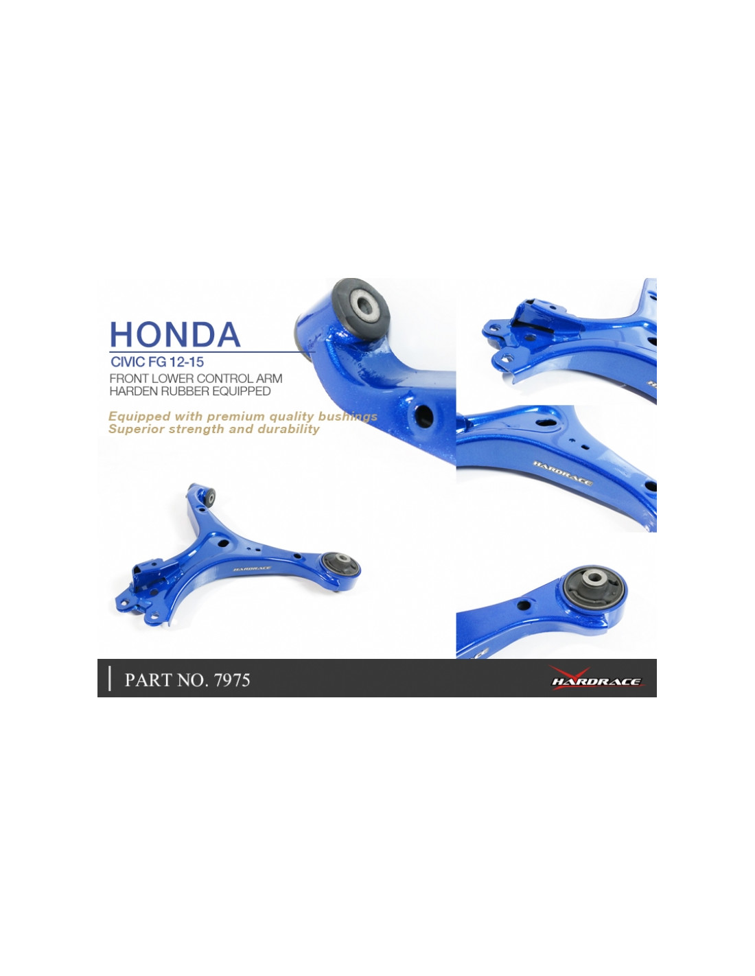 Hardrace suspension arm for Honda Civic. Ideal for improving steering precision, stability, and response. Manufacturer's specifications : - Compliance Bushing: 14mm Harden Rubber Equipped 2 PCS/SET * Not for '14-15 SI Use