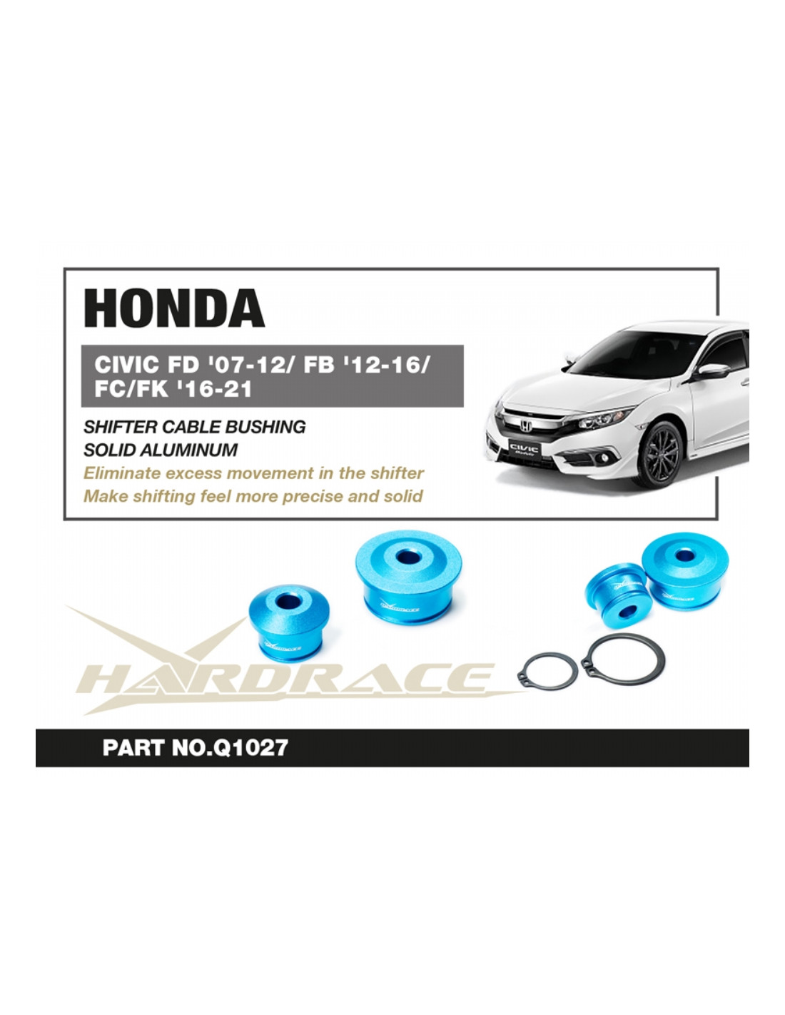 Hardrace silent block for Honda Civic. Ideal for improving driving precision, trim stability, and steering response. Manufacturer's specifications : - Solid Aluminum. For MT Use. 2 PCS/SET.