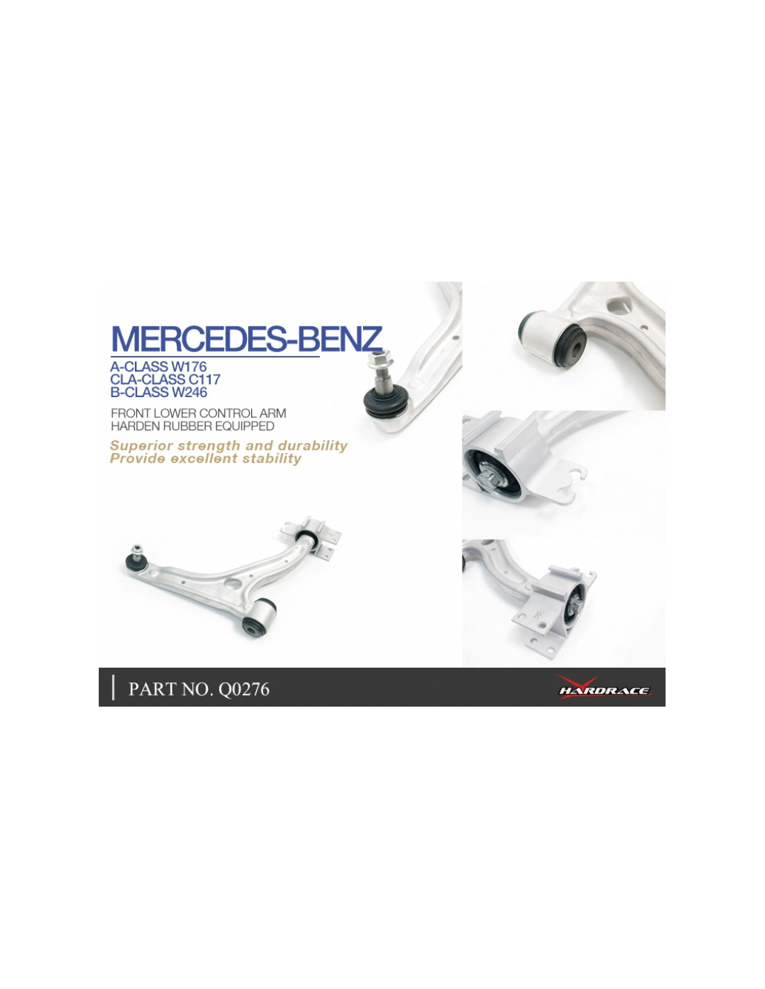 Hardrace suspension arm for Infiniti Q30, Mercedes A-class, B-class, CLA-class. Ideal for improving driving precision, ride stability, and steering response. Manufacturer's specifications : - Harden Rubber Equipped 2 PCS/SET Aluminum Forged