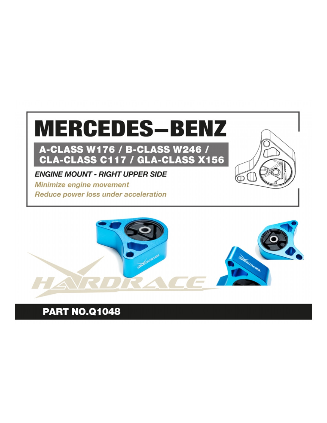 Hardrace engine mount for Mercedes A-class, B-class, Cla-class, Gla-class. Ideal for improving driving precision, ride stability and steering response. Manufacturer's specifications : - For 2.0T Engines 1 PCS/SET