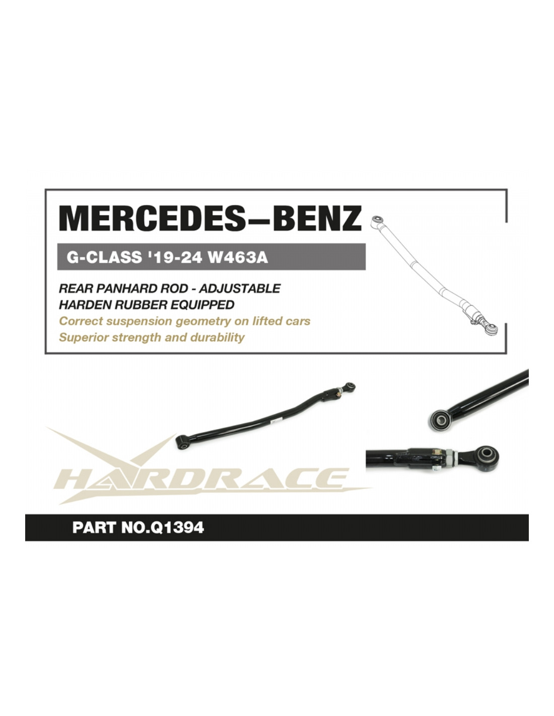 Hardrace suspension arm for Mercedes G-Class. Ideal for improving steering precision, stability, and response. Manufacturer's specifications : - Harden Rubber Equipped 1 PCS/SET