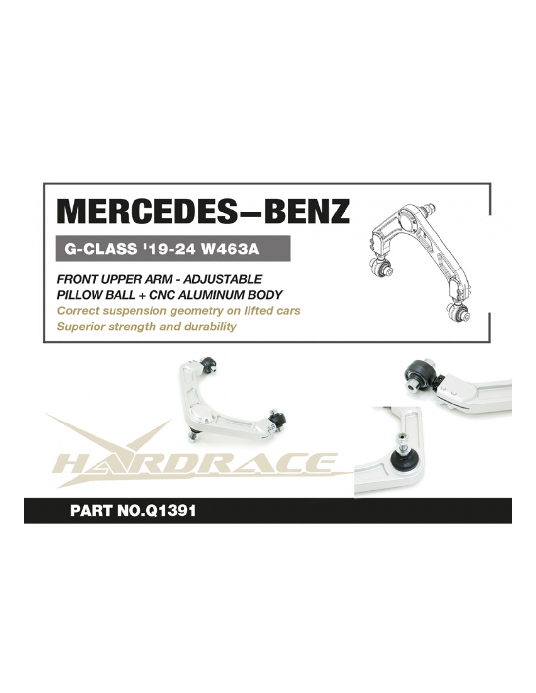 Hardrace suspension arm for Mercedes G-Class. Ideal for improving steering precision, stability, and response. Manufacturer's description: - Adjustable Pillow Ball Equipped CNC aluminum arm 2 PCS/SET