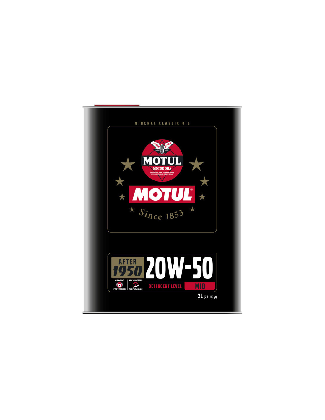 Perfect for your historic vehicles!Mineral oil grade 20W50Sold per 2 litre tinsFor vehicles built between 1950 and 1970Engine and gearboxMotul Historique Engine Oil - 20W50This lubricant is specially designed for engines built between 1950 and 1970. It is a mineral multigrade lubricant with middle detergent level compatible with elastomer gaskets. 20W50 oil meets standards of the 1950 – 1970 period (API SF/CC) while benefiting from the advanced technology of the Motul lubricants.This oil benefits from a unique combination of additives including a high zinc content and molybdenum to deliver the best performance and offer superior protection for mechanical parts such as tappets rocker arms and rocker arm rods. This oil is perfectly suitable for narrowed running clearances of the engine and has anti-corrosion and anti-wear properties.