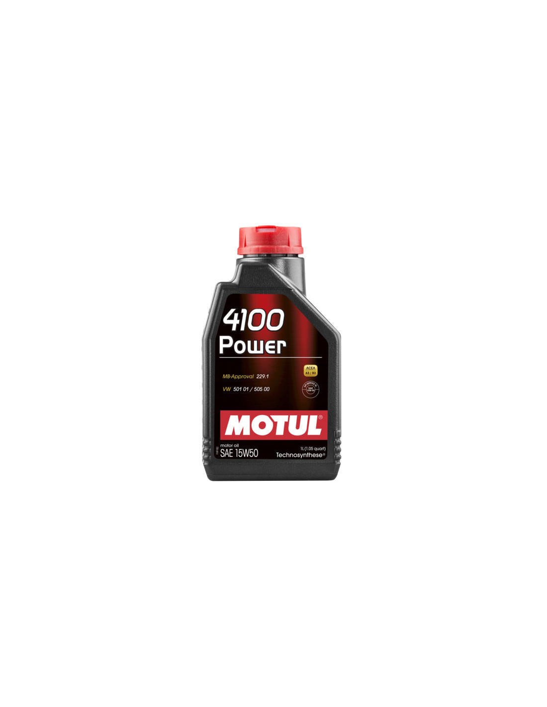 Motul 4100 Power 15W50 Engine OilThe latest Technosynthese formulaGrade 50 when hot suitable for engines that consume oilGrade 15W50Mercedes and Volkswagen standardsACEA A3 / B4 API SL / CF certifiedPackaging : 1 litre bottleMotul 4100 Power 15W50 Engine Oil SpecificationsThis high performance oil is compatible with both petrol and diesel engines turbocharged or n/a multivalve carburetor or direct injection engines with or without a catalytic converter. The high hot viscosity (SAE 50) is perfectly suitable for engines that consume a lot of oil. This oil meets the following manufacturer standards :Mercedes MB-Approval 229.1Volkswagen 501 00 505 00ACEA A3 / B4 API SL / CF certified