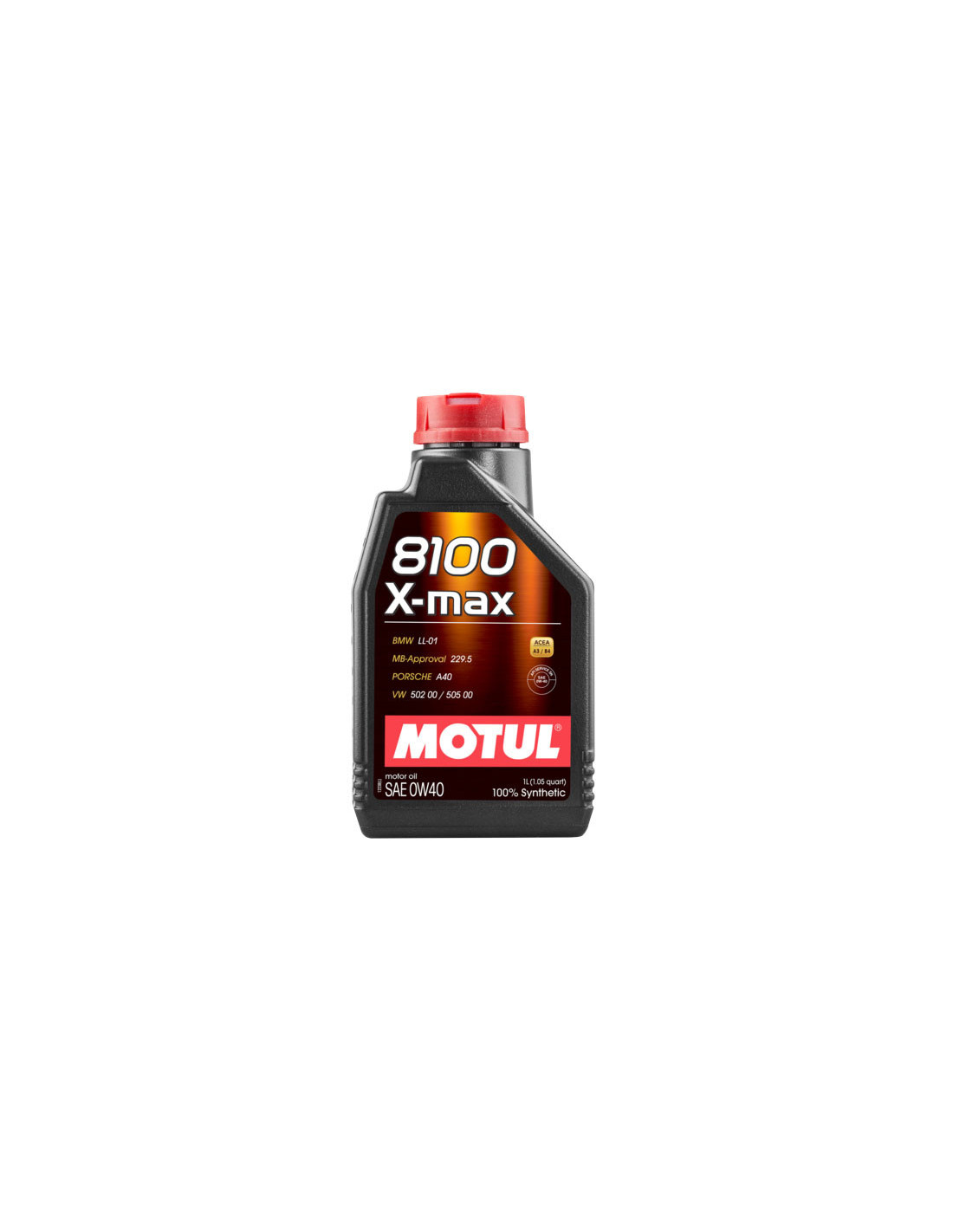 Motul 0W40 8100 X-Max Engine Oil100% synthetic 0W40 oilEspecially designed for recent powerful carsApproved by BMW Mercedes VAGCompatible with petrol and diesel engines with or without DPFPackaging : 1 litre bottleMotul 0W40 8100 X-Max Engine Oil (BMW Mercedes VAG) SpecificationsHigh performance 100% Synthetic lubricant specially designed for the latest generation cars powered by Gasoline or Diesel direct injection engines. Recommended for high output performance engines (eg. BMW FORD MERCEDES). Anti-wear properties. Excellent high temperature stability. Boosted performance and better acceleration.BMW Long Life (LL-01)Volkswagen 502 00 / 505 00Mercedes 229.5ACEA A3/B4API SERVICES SN