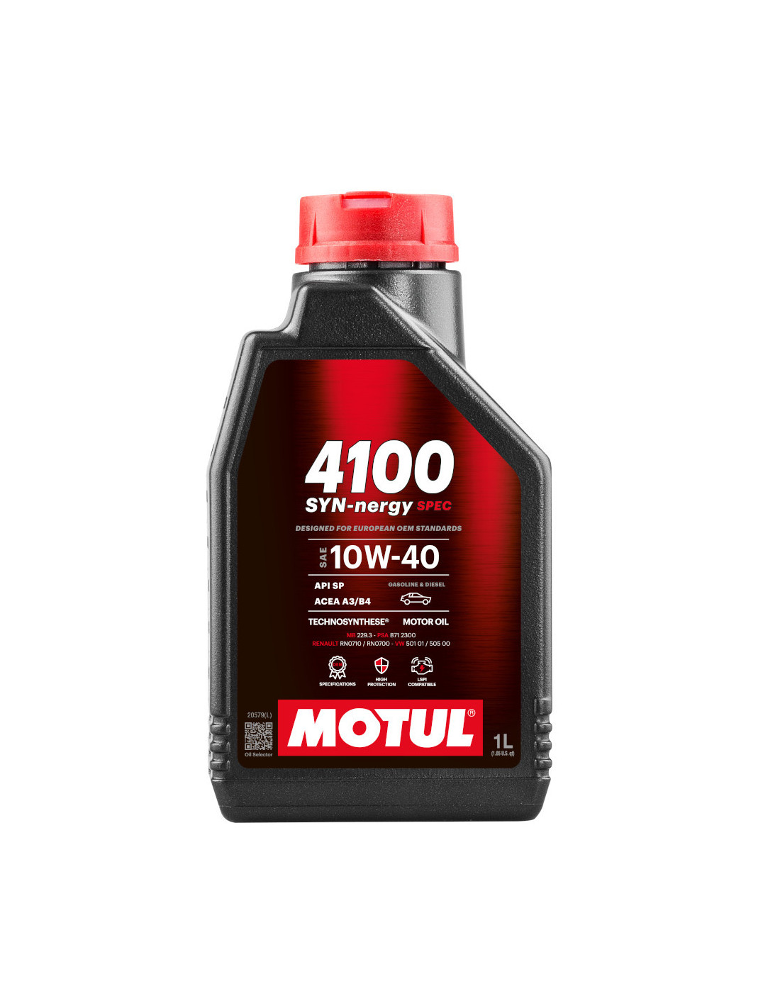 Motul 4100 Syn-nergy Spec Engine OilGrade 10W40Perfect for European vehiclesCompatible with all types of enginesLong lifeNumerous manufacturer standardsACEA A3 and B4 certifiedSold in 1 liter bottlesMotul 4100 Syn-nergy Spec Engine Oil - 10W40 1LMotul 4100 Syn-nergy Spec 10W40 oil is specified to meet the requirements of recent high-performance engines used for either daily or sports use. Ideal for European vehicles this oil is compatible with N/A turbocharged gasoline diesel injection or carburetor using all types of fuel (leaded and unleaded diesel LPG and E85) with or without a catalyst.The reinforced Technosynthese synthetic base limits the volatility of this oil. It provides very high lubricity reducing friction and withstanding the high temperatures reached: extended drain intervals limited lubricant consumption. This oil meets API SP and ACEA A3/B4 standards.Manufacturer's approvals :Mercedes MB-Approval 229.3Renault RN0710 / RN0700Volkswagen 501 01 / 505 00PSA B71 2300