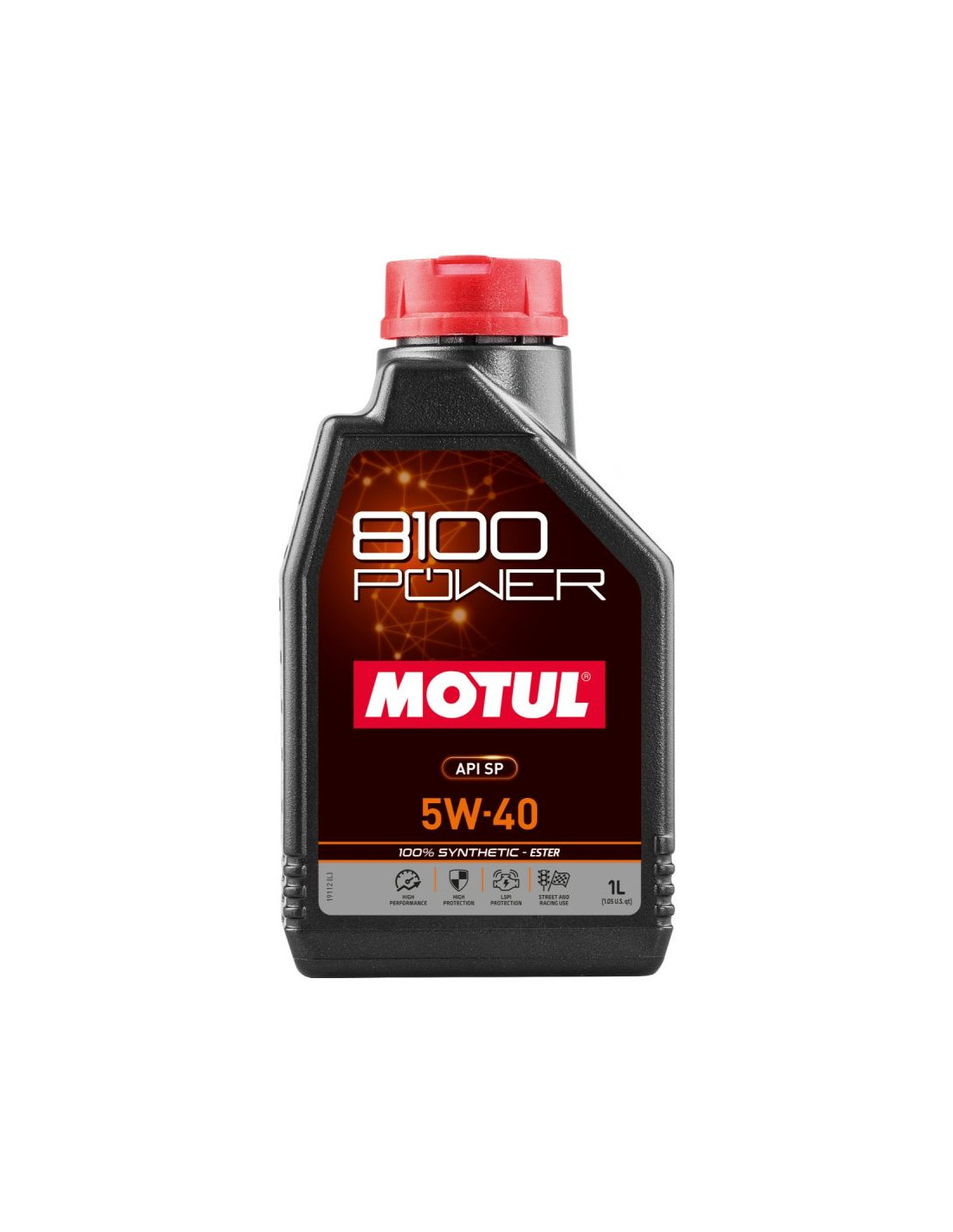Motul 8100 Power 5W40 Oil100% synthetic very high performance engine oilGrade 5W40Designed for very high performance petrol and diesel enginesAPI SP standardPackaging : 1 liter bottleMotul 8100 Power 5W40 Engine Oil SpecificationLocated in the Motul range just below the famous 300V reserved for competition this 100% synthetic 5W40 grade ester-based motor oil is specially formulated for very high performance naturally-aspirated or turbocharged petrol and diesel engines. It is particularly suitable for tuned engines used intensively. This lubricant ensures exceptional oil film resistance at very high temperatures and maximum protection against wear. Oil pressure remains stable under all operating conditions. This oil meets the API SP standard guaranteeing excellent protection against LSPI (low-speed pre-ignition) and is fully compatible with the use of so-called alternative fuels (LPG CNG Bioethanol E85).