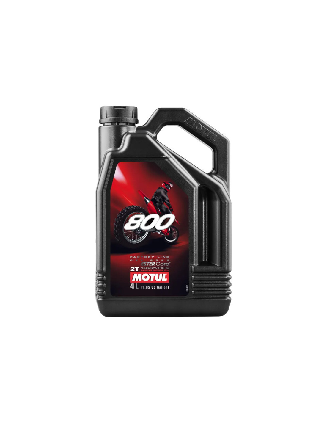 Motul 800 FL Off RoadTo suit 2-stroke motorbike engines using premix100% synthetic base with ESTER Core technologyOptimised for intensive off-road useMaximum engine protection and extreme reliabilityImproved engine efficiencyUltra-high lubricating powerSold per 4 litresMotul 800 2T FL Off Road Motorcycle Engine Oil (4L)Motul 800 2T Factory Line Off Road is a 100% synthetic high-performance oil for 2-stroke motorbike engines used in off-road applications. It is suitable for engines with premix only and can be used with conventional unleaded fuels up to 124 octane. This lubricant is particularly suitable for off-road racing bikes whether in Moto-Cross Enduro or Trials... It is also compatible with ATVs watercrafts etc.Featuring ESTER Core technology this top-of-the-range oil is formulated with esters combined with other high-performance synthetic base oils and a range of innovative additives. This technology enables maximum engine power output without compromising on reliability and wear. It guarantees enhanced desemulsion properties reduced friction perfect lubrication of the engine and its internals and protection from sticking of piston rings and exhaust power valves.Motul recommends a reference mixing ratio for Moto Cross Grand Prix of 2% (50:1). If the oil is used in less difficult conditions it is advisable to reduce the percentage by 0.5%. Finally the mixing ratio should be tuned in the event of specific use.