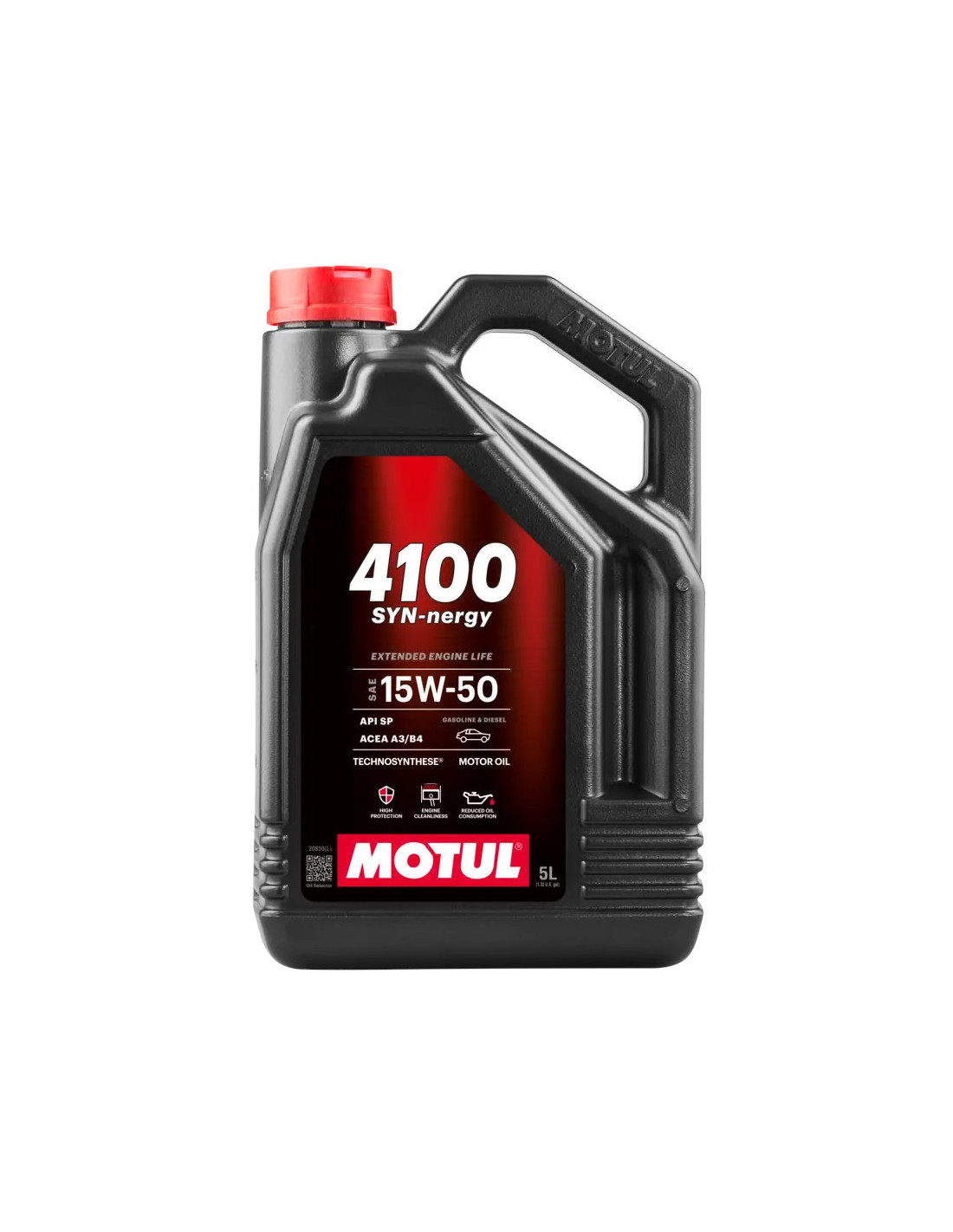 Motul 4100 Syn-nergy 15W50 Engine OilThe latest Technosynthese formulaGrade 50 when hot suitable for engines that consume oilGrade 15W50ACEA A3 / B4 API SP certifiedSold in 5 litre cansMotul 4100 Syn-nergy 15W50 Engine Oil SpecificationsThis high performance oil is compatible with both petrol and diesel engines turbocharged or n/a direct or indirect injection engines with or without a catalytic converter. It provides superior protection for longer engine life. The high hot viscosity (SAE 50) is perfectly suitable for engines that consume a lot of oil. This oil meets the ACEA A3 / B4 and API SP standards.