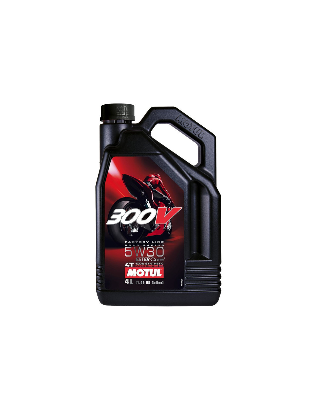 Motul 300V FL Road RacingTo suit 4-stroke motorbike enginesGrade : 5W30100% synthetic base with ESTER Core technologyOptimised for intensive road and track useMaximum engine protection and extreme reliabilityImproved engine efficiencyHigh temperature stabilitySold per 4 litresMotul 300V 4T FL Road Racing 5W30 Motorcycle Engine Oil (4L)Motul 300V 4T Factory Line Road Racing is a 100% synthetic high-performance oil for 4-stroke motorbike engines used in track and road racing. It is suitable for engines with integrated or non-integrated gearboxes and wet or dry clutches. This lubricant is particularly designed for motorcycles competing in Endurance SuperSport SuperBike Superstock MotoGP hill-climb or drag racing etc. It is also compatible with motorbikes fitted with catalytic converters side-cars ATVs etc. Featuring ESTER Core technology this top-of-the-range oil is formulated with esters combined with other high-performance synthetic base oils and a range of innovative additives. This technology enables maximum engine power output without compromising on reliability and wear. It guarantees a power increase up to 1.3% optimum gearbox protection an extreme reduction in internal friction and constant oil pressure whatever the conditions of use.This oil meets the requirements of JASO standard T903 on the operation of wet clutches. For optimum engine and clutch performance Motul recommends not mixing this lubricant with other synthetic or mineral oils. The drain interval should be adapted according to use.