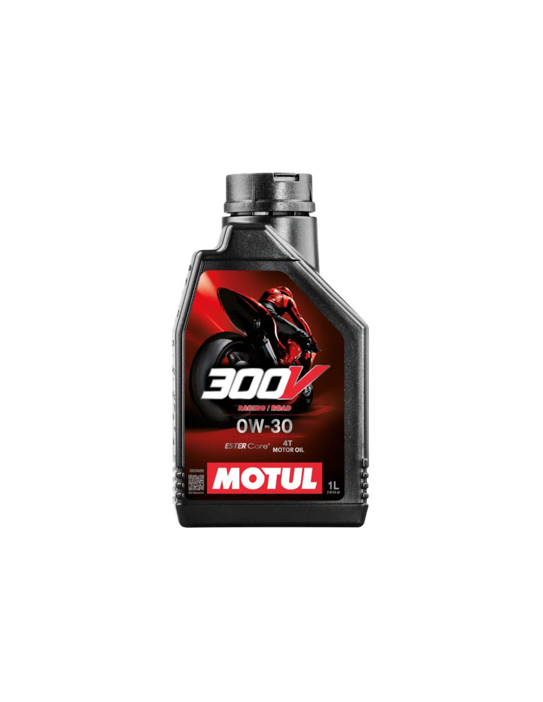 Motul 300V Road RacingTo suit 4-stroke motorbike enginesGrade : 0W30ESTER Core technologyOptimised for factory and high-performance stock motorcyclesImproved reliabilityIncreased powerUltimate engine response and accelerationSold per 1 litreMotul 300V 4T Road Racing 0W30 Motorcycle Engine Oil (1L)Motul 300V 4T Road Racing is a competition oil developed for factory and high-performance stock motorcycles powered with 4-stroke engines. Intended for two-wheelers used on the track or on the road this lubricant increases power for improved engine response and acceleration. This lubricant is also suitable for motorbikes fitted with catalytic converters side-cars ATVs etc. Featuring ESTER Core technology this top-of-the-range oil is formulated with esters combined with other high-performance synthetic base oils and a range of innovative additives. This technology enables maximum engine power output without compromising on reliability and wear thanks to the ultra-adhesive properties of the oil film.This oil exceeds current API / JASO standards. For optimum engine and clutch performance Motul recommends not mixing this lubricant with other synthetic or mineral oils. The drain interval should be adapted according to use.
