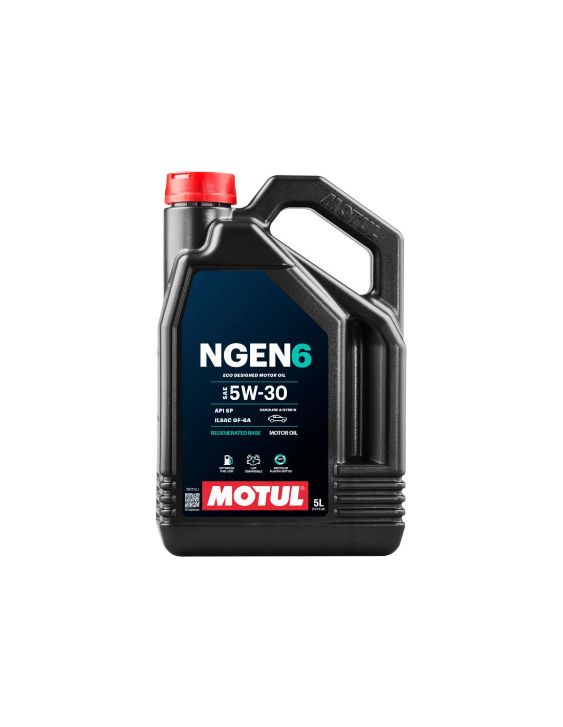 Motul NGen 6 5W30 OilNew more sustainable formulationSynthetic engine oil with regenerated baseGrade 5W30Designed for recent petrol & hybrid petrol enginesFuel economyAPI SP ILSAC GF-6A standardsSold per 5 liter cansMotul NGen 6 5W30 Engine Oil SpecificationsThe Motul NGen range is based on a new sustainable concept that combines a synthetic formula favouring the use of regenerated base oils as well as containers made from 50% recycled plastic and 100% recyclable. This eco-friendly approach contributes to a significant reduction in the manufacturer's carbon footprint.This high-quality 5W30 ‘Energy Saving’ motor oil has been specially designed for latest-generation cars equipped with petrol and petrol-hybrid engines naturally aspirated or turbocharged with direct or indirect injection designed to use low-friction low-viscosity HTHS (High Temperature High Shear) lubricants.This oil improves fuel economy enhances engine response and reduces the risk of LSPI (Low Speed Pre-Ignition). It complies with API Service SP and ILSAC GF-6A standards and is compatible with catalytic converters.