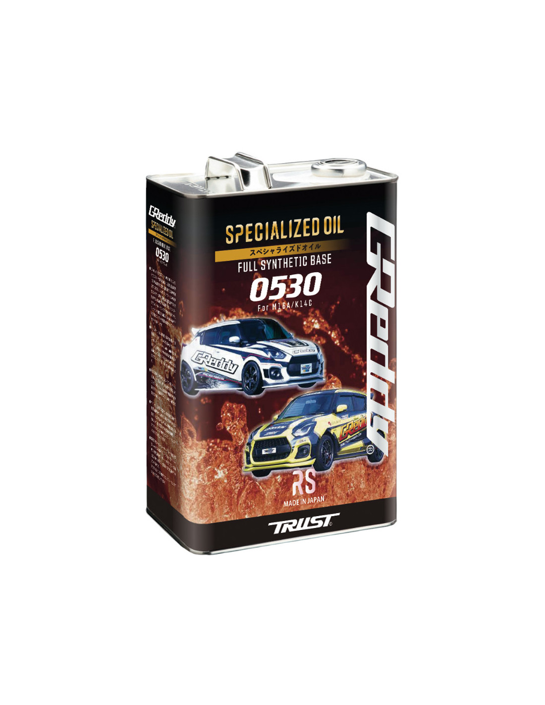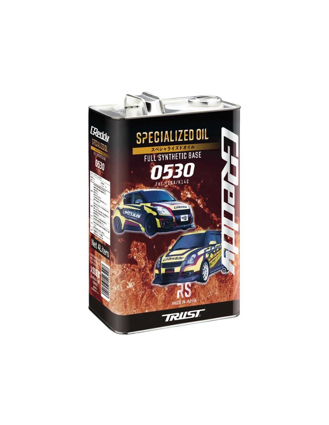 GReddy 0530 RS Oil 100% synthetic engine oil Specifically formulated for Suzuki Swift Sport Street and track use Grade : 5W30 Packaging : 4 liter can GReddy part number : 17501272 GReddy 0530 RS Specialized Engine Oil (4L Swift Sport) SpecificationsGReddy 0530 RS (for "Racing Spec") is a high-performance engine lubricant specially designed for the M16A and K14C engines of Suzuki Swift Sport used on street or on racetrack. Guaranteeing hydraulic stability at high temperatures and loads its ester and PO2-based formula provides sharp engine response and eliminates power loss.This oil also has excellent low-temperature viscosity characteristics effectively protects the engine in all operating conditions and is compatible with vehicles fitted with an aftermarket turbo or supercharger. Made in Japan this 100% synthetic oil is packaged in 4-litre cans.