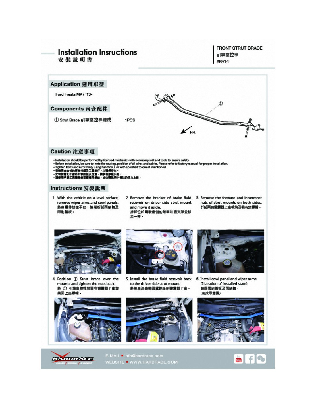 Hardrace strut brace for Ford Fiesta. Ideal for improving steering precision, stability, and response. Manufacturer's specifications : - 1 PCS/SET * For LHD models * For 1.0T/ST Use
