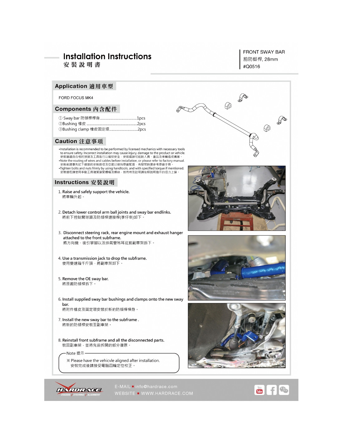 Hardrace stabilizer bar for Ford Focus. Ideal for improving driving precision, ride stability, and steering response. Manufacturer's specifications : - For non-ST & 2.3 ST Use 28 mm 5 PCS/SET