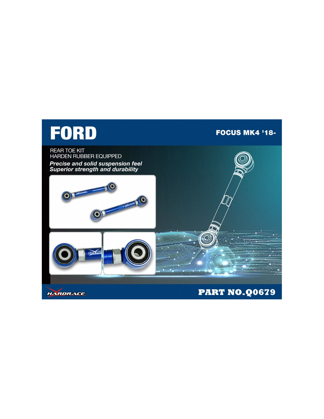 Hardrace suspension arm for Ford Focus. Ideal for improving steering precision, stability, and response. Manufacturer's description: - Harden Rubber Equipped. 2 PCS/SET