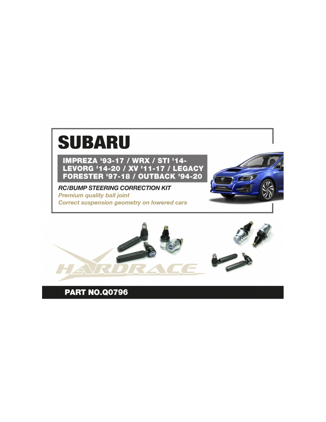 - Subaru > XV (2nd Gen) 2018-2022 > SUV (GT) 2018-2022 > XV 2.0 (AWD) 2018-2022 Note: - Ricambio specifico per i modelli indicati (verificare sempre il codice Hardrace prima dell'ordine) - Si consiglia il montaggio in officina specializzata - Prodotto adatto a uso stradale e sportivo. Compatibilità veicoli: Subaru Forester SF (1997-2002), Subaru Forester SG (2002-2008), Subaru Forester SH (2008-2013), Subaru Forester SJ (2013-2018), Subaru Forester 5th Gen (2018-2023), Subaru Impreza GFC (1996-1999), Subaru Impreza GG/A (2000-2002), Subaru Impreza GG/B-E (2002-2005), Subaru Impreza GG/F-G (2005-2007), Subaru Impreza GD/A (2000-2002), Subaru Impreza GD/B-E (2002-2005), Subaru Impreza GD/F-G (2005-2007), Subaru Impreza GH (2007-2012), Subaru Impreza GP (2012-2016), Subaru Impreza GJ (2012-2016), Subaru Legacy BG (1994-1999), Subaru Legacy BD (1994-1999), Subaru Legacy BH (1998-2003), Subaru Legacy BE (1999-2003), Subaru Legacy BP (2003-2009), Subaru Legacy BL (2003-2009), Subaru Legacy BR (2009-2014), Subaru Legacy BM (2009-2014), Subaru Legacy BN, Subaru Levorg VM (2015-2020), Subaru WRX VA (2014-2021), Subaru XV GP (2012-2017), Subaru XV GT (2018-2022).