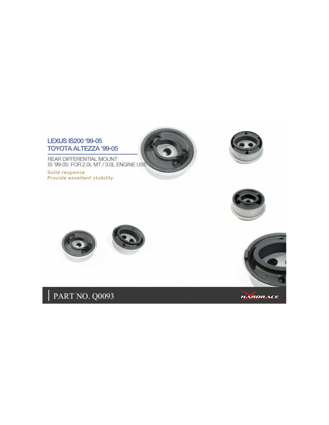 Hardrace silent block for Lexus GS, IS, Toyota Altezza, Mark ii. Ideal for improving driving precision, trim stability and steering response. Features from the manufacturer (original description in English): - 2PCS/SET * IS '99-05: FOR 2.0L MT / 3.0L ENGINE USE * GS '06-11: NOT FOR 3.5L ENGINE USE