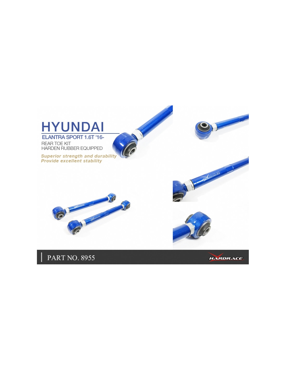 Hardrace Suspension Arm for Hyundai. Ideal for improving steering precision, stability, and response. Manufacturer's Specifications : - Harden Rubber Equipped. *For Multi-link rear axle *Including I30 N/Veloster N 2 PCS/SET