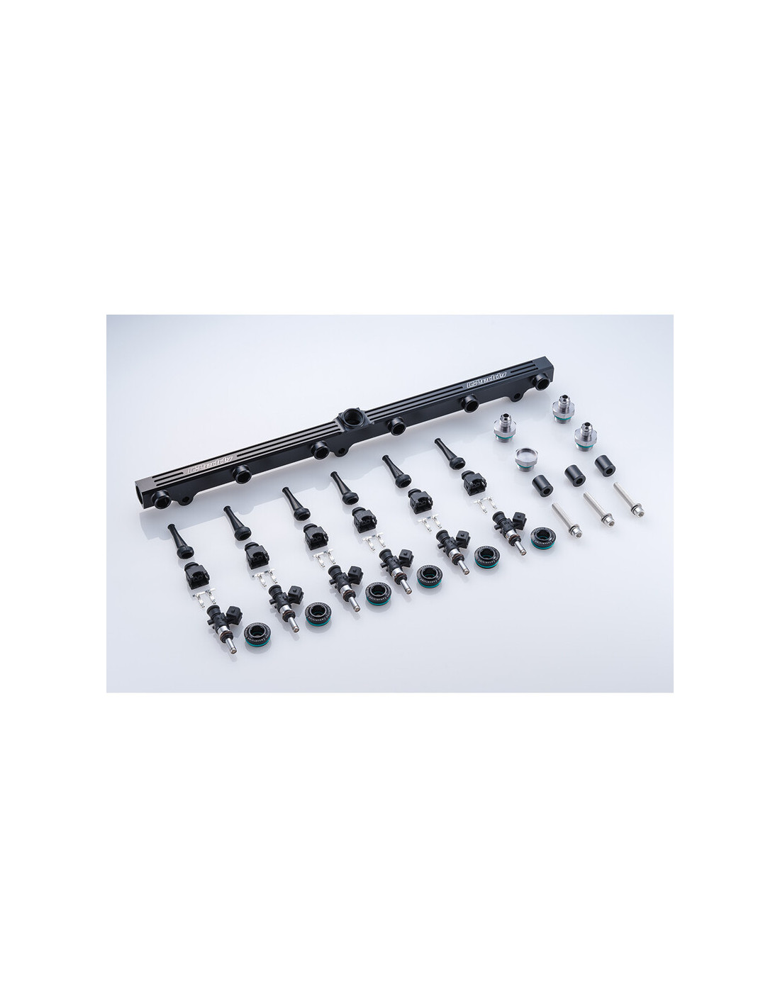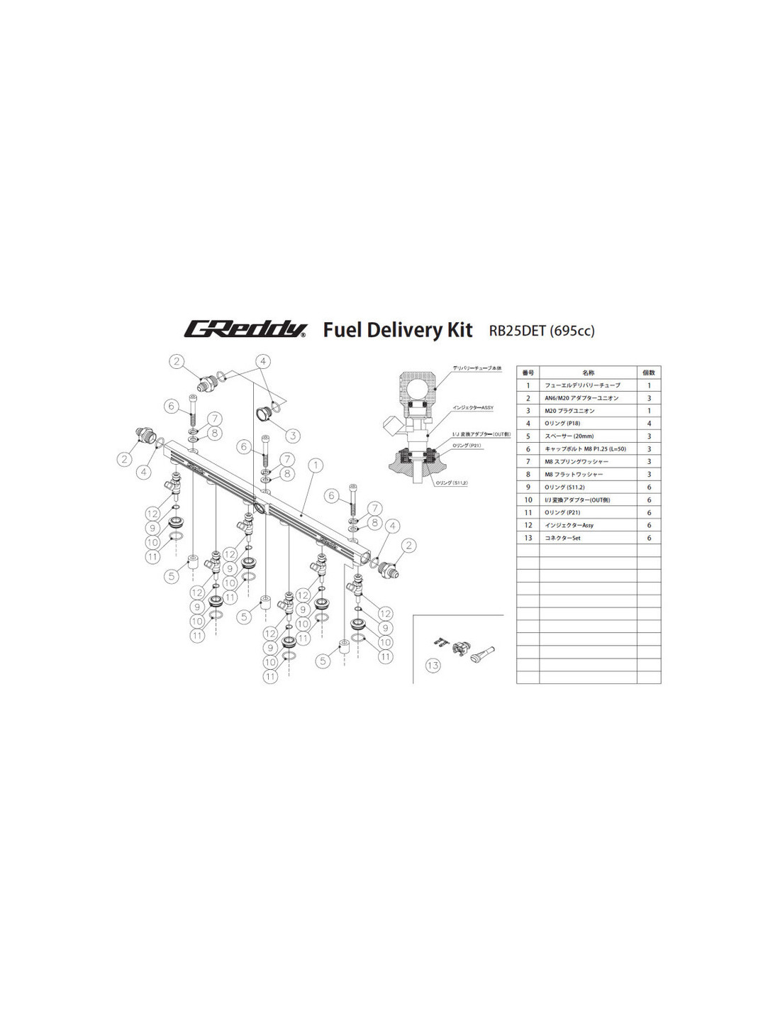 GReddy Injector Kit To suit Nissan SR20DET Black Top (S14 & S15) Flow rate(s) : 695 cc/min, 834 cc/min, 931 cc/min Type : top feed Direct OEM replacement Flawless quality and reliability GReddy part number(s) : 13923310, 13923311, 13923312, 13923313, 13923314, 13923315 GReddy Injector Kit for Nissan SR20DET (S14/S15) Specifications This GReddy kit, specially designed for the Nissan S14 and S15 SR20DET engine, includes a fuel rail and a set of 695 cc, 834 cc or 931 cc injectors (as required) with connectors, terminals and sleeves to significantly improve the fuel supply to the turbocharged Nissan 4-cylinder. Developed to be 100% "plug and play", this kit combines top quality and reliability and can be installed in place of the OEM components, with no modifications required. Please note that this kit is available in two variants: compatible with the stock intake manifold (surge tank) or compatible with the GReddy intake manifold (surge tank). Technical Data P/N 13923310 / 13923313 Flow rate (cc/min) : 695 (3 bar) System : top feed Spray pattern : conical (9 holes) Connector : Jetronic (square) Resistance : 12 Ω P/N 13923311 / 13923314 Flow rate (cc/min) : 834 (3 bar) System : top feed Spray pattern : conical (7 holes) Connector : Jetronic (square) Resistance : 12 Ω P/N 13923312 / 13923315 Flow rate (cc/min) : 931 (3 bar) System : top feed Spray pattern : conical (7 holes) Connector : Jetronic (square) Resistance : 12 Ω Kit Details for Stock Surge Tank (See Diagram) 1) Fuel delivery tube x1 2) AN6/M20 adapter union x3 3) M20 plug union x1 4) O-ring (P18) x4 5) Spacer (37 mm) x1 6) Spacer (20 mm) x2 7) Cap bolt M8 P1.25 (L=60) x1 8) Cap bolt M8 P1.25 (L=40) x2 9) M8 spring washer x3 10) M8 flat washer x3 11) O-ring (S11.2) x4 12) I/J conversion adapter (out side) x4 13) O-ring (P21) x4 14) IAA unit adapter x1 15) ⌀15-1/4PT hose union x1 16) Cap bolt M6 P1.0 (L=55) x3 17) M6 spring washer x3 18) M6 flat washer x3 19) IAA unit gasket x2 20) Hose joint ⌀15 x1 21) Hose band #8 x2 22) Acrylic hose ⌀15 500 mm x1 23) Injector assy x4 24) Connecter set x4