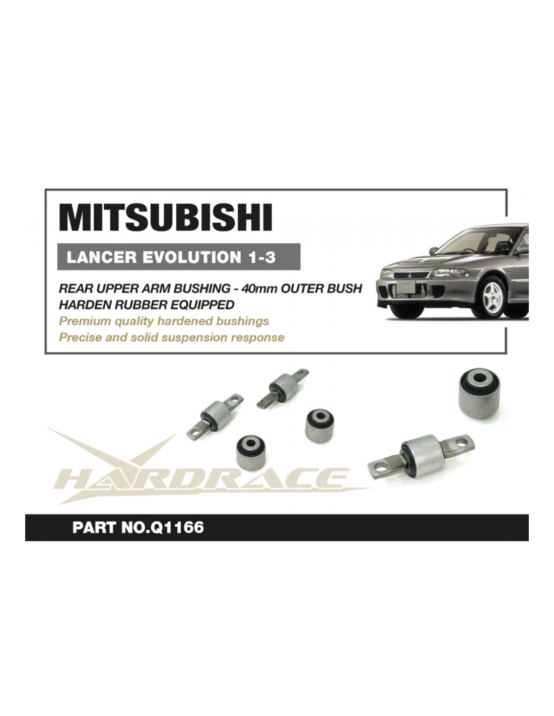 Hardrace silent block for Mitsubishi Lancer Evolution. Ideal for improving driving precision, trim stability, and steering response. Features from the manufacturer (original description in English): - Harden Rubber Equipped 40mm Outer Bush 4 PCS/SET