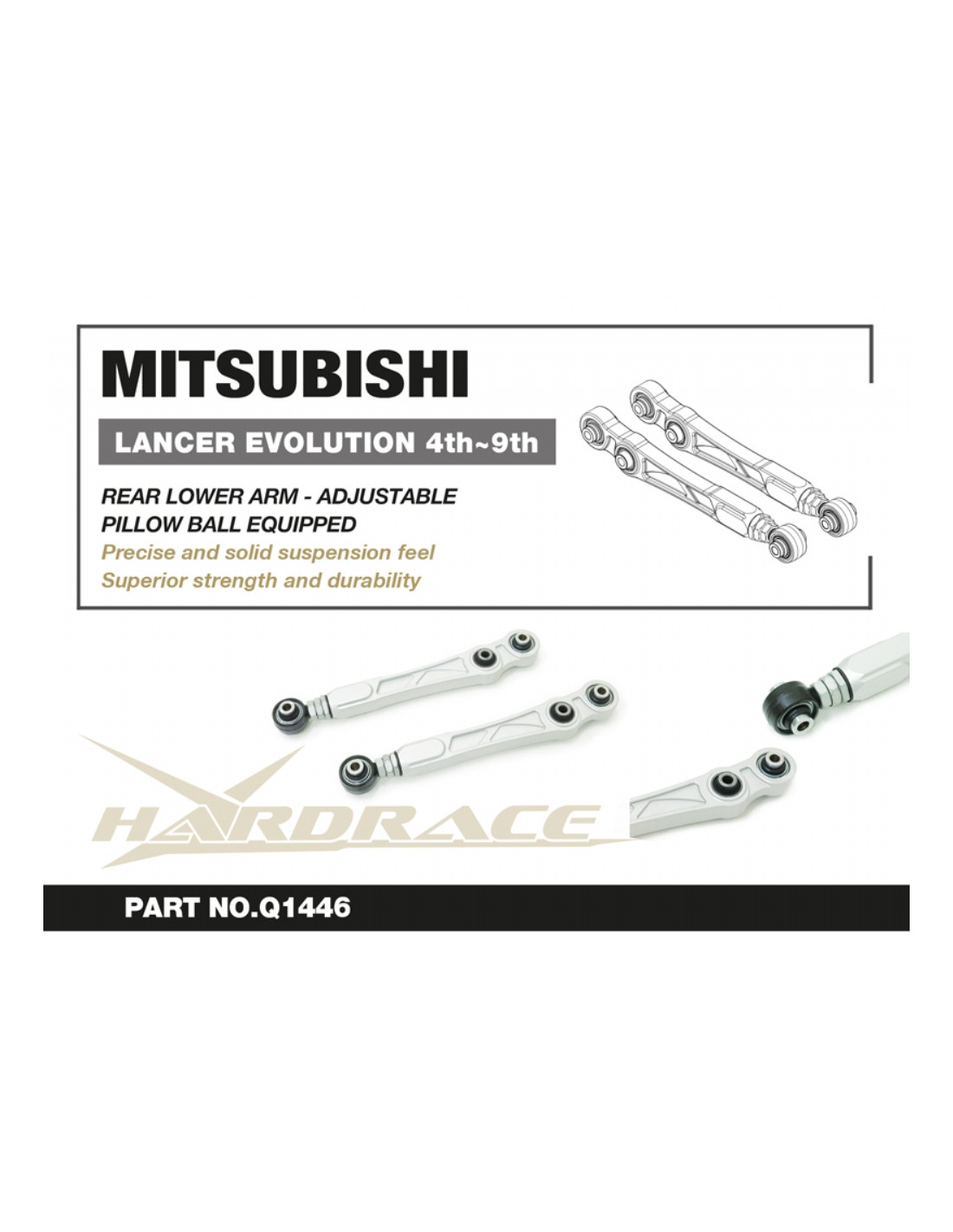 Hardrace suspension arm for Mitsubishi Lancer Evolution. Ideal for improving steering precision, stability, and response. Manufacturer's description: - Pillow Ball Equipped 2 PCS/SET