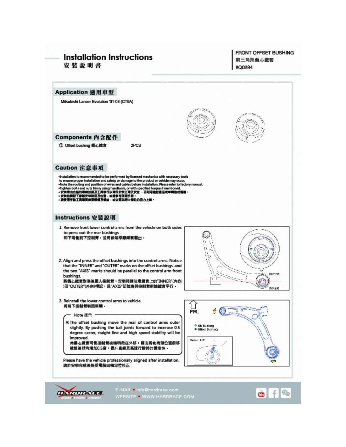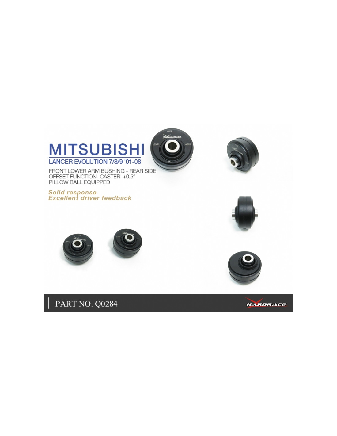 Hardrace silent block for Mitsubishi Lancer evolution. Ideal for improving driving precision, trim stability and steering response. Features from the manufacturer (original description in English): - Pillow Ball Equipped 2 PCS/SET REAR SIDE OFFSET FUNCTION - CASTER: +0.5°
