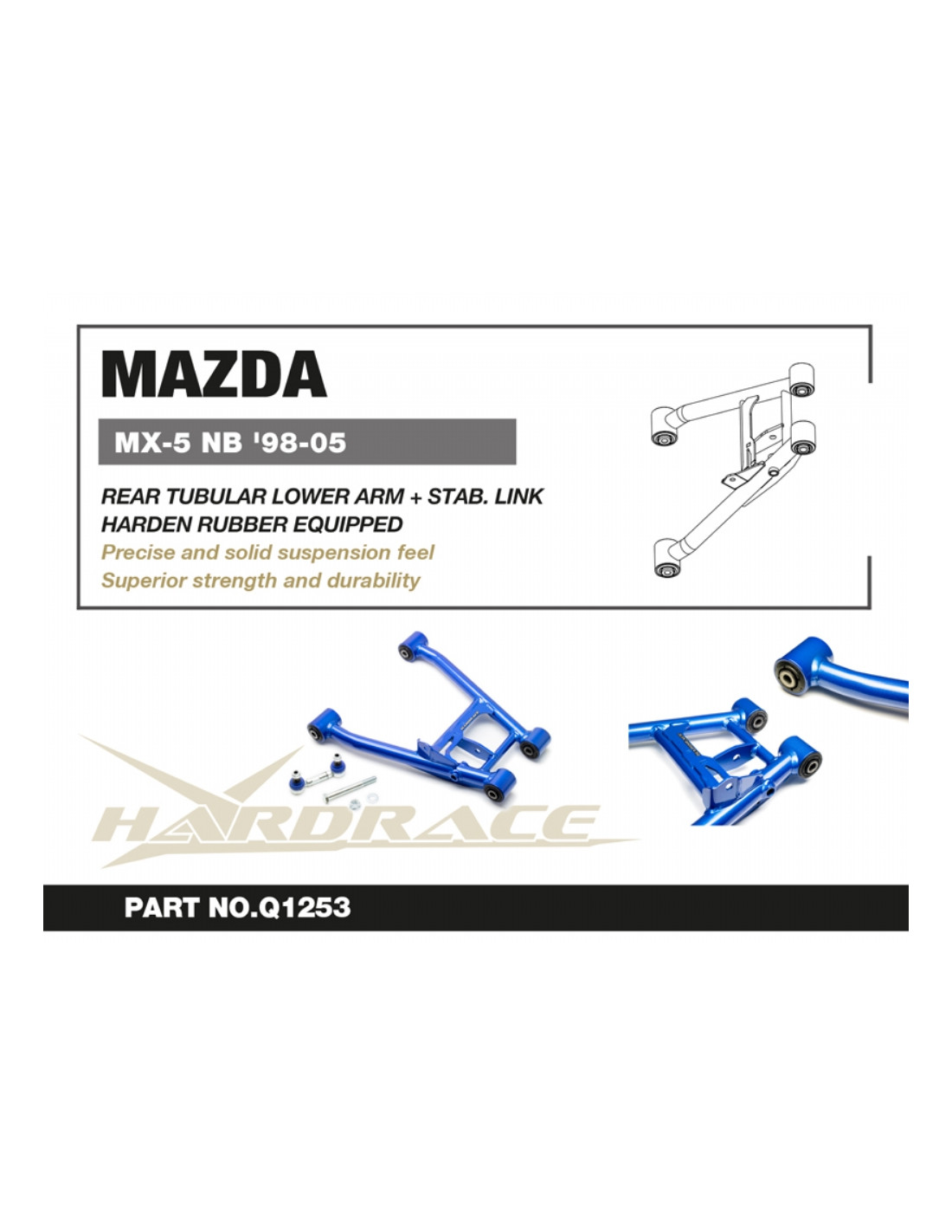 Hardrace Suspension Arm for Mazda MX-5 MIATA. Ideal for improving steering precision, stability and response. Manufacturer's Description: - Tubular Type Harden Rubber Equipped Stab. Link Included 4 PCS/SET