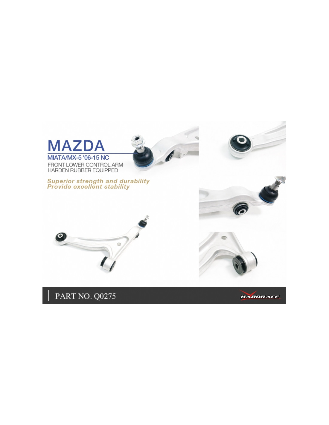 Hardrace Suspension Arm for Mazda MX-5 Miata, RX-8. Ideal for improving steering precision, stability and response. Manufacturer's Description: - Harden Rubber Equipped Forged Aluminum 2 PCS/SET
