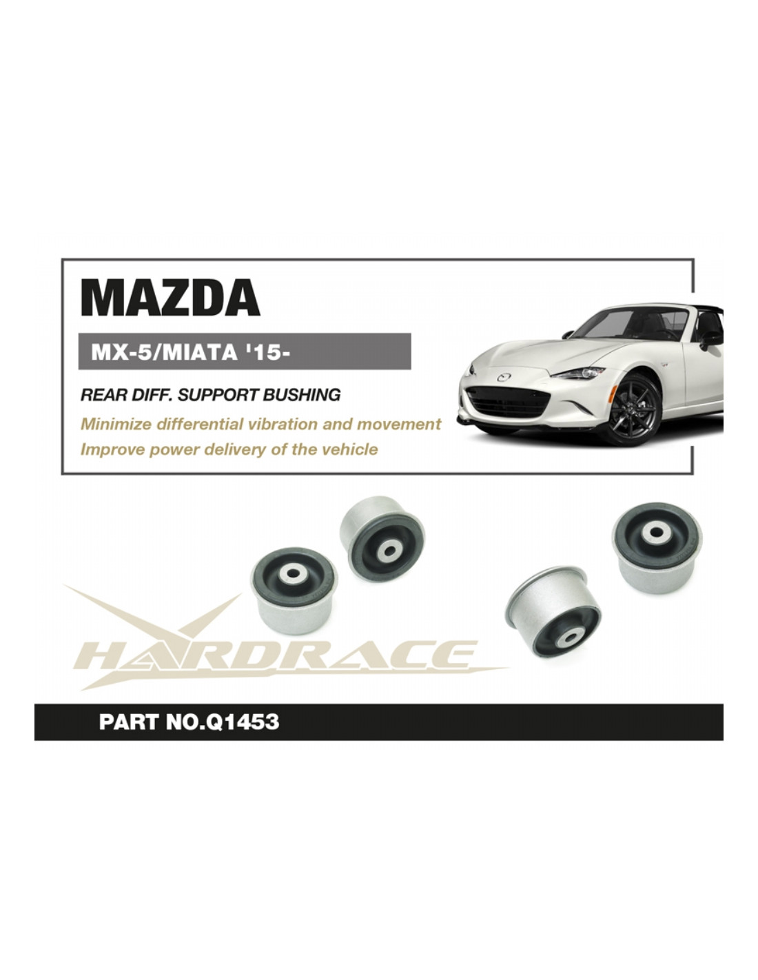 Hardrace silent block for Mazda MX-5 MIATA. Ideal for improving driving precision, trim stability, and steering response. Manufacturer's specifications : - Harden Rubber Equipped 2 PCS/SET