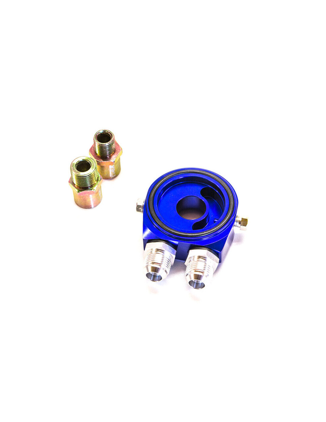 Sandwich Plate with -Dash 10 Line Fittings and 1/8" NPT Sensor Ports This sandwich plate is the ultimate in terms of connectivity. It comes with 2 ports for 1/8" NPT sensors and 2 Dash 10 male fittings for adding oil cooler lines : you can install an oil cooler oil temperature sensor and oil pressure sender. Supplied with 2 block adapters : 3/4" -16UNF and M20 this sandwich plate guarantees compatibility with most of the engines on the market such as Nissan Toyota Honda Mazda etc... If you have any doubt regarding fitment please contact us. The 1/8" NPT sensor fittings are compatible with most gauges on the market such as Defi Stack VDO Prosport etc... Blanking plugs are provided for when a port is not in use. Mounting is easy with no modification however please ensure that you have approx 25 mm additional oil filter clearance as the plate will move the filter directly upwards. When fitting the plate lubricate the o-rings with some engine oil to prevent damage. Note : This sandwich plate is not thermostatic so oil will circulate constantly.